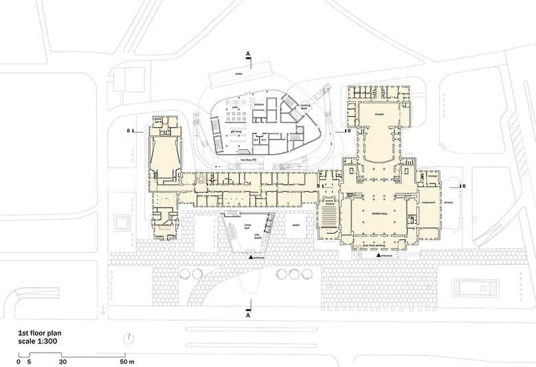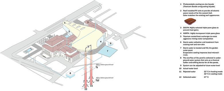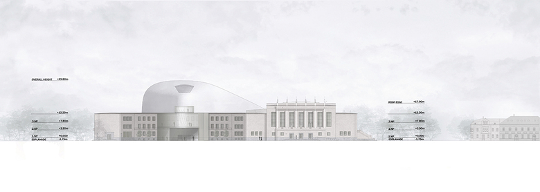 Urban traffic noise is shielded by positioning the hall facing the existing park on the building’s rear, while a new entrance on the promenade rises to glide over the top of the existing historical Cultural Center in a sky-lit lobby for the new hall. A dramatic complimentary contrast between new and old creates a cultural landmark for Ostrava.