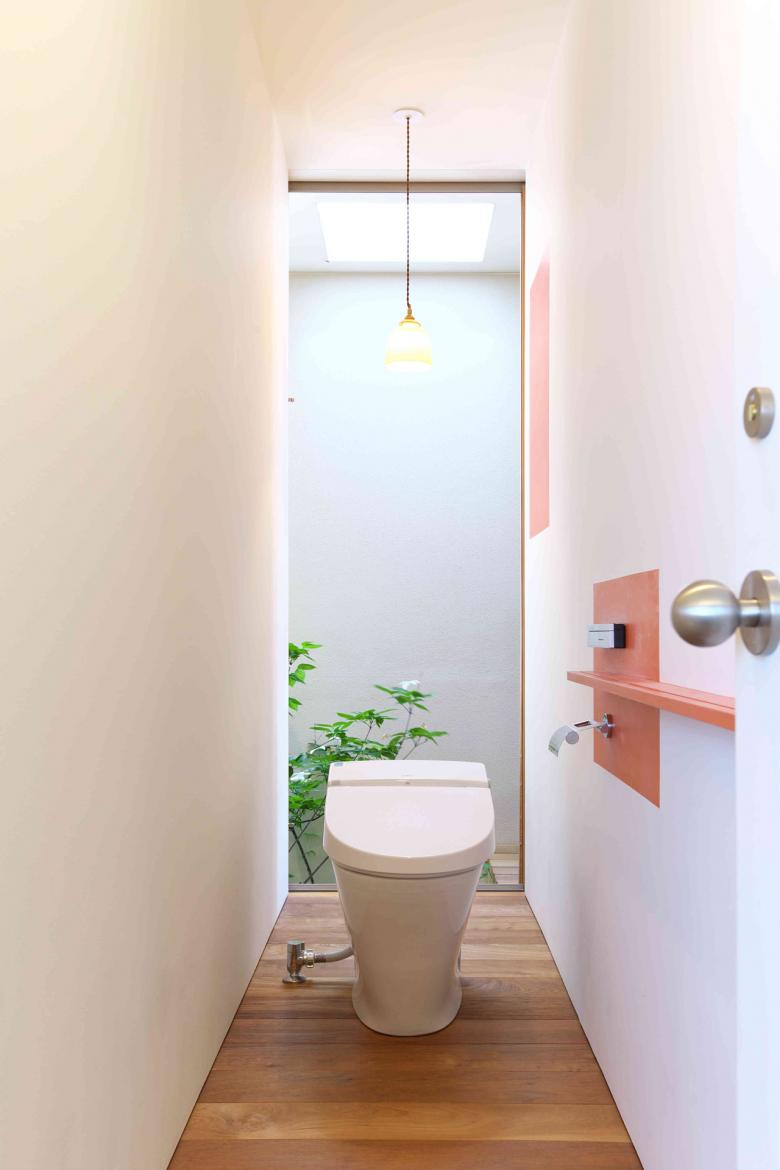2Fは片廊下形式とし、そこからゆるやかに区切られたリビング、ダイニング、キッチン、トイレにアプローチする。LDKを大きなワンルームとはせずに小さく分割し、それらを片廊下で結び、その廊下に全長12mを超すワークカウンターと本棚を設置することで「LとDとKの間」を、夫婦ともに大好きな「沢山の書籍」で充填している。