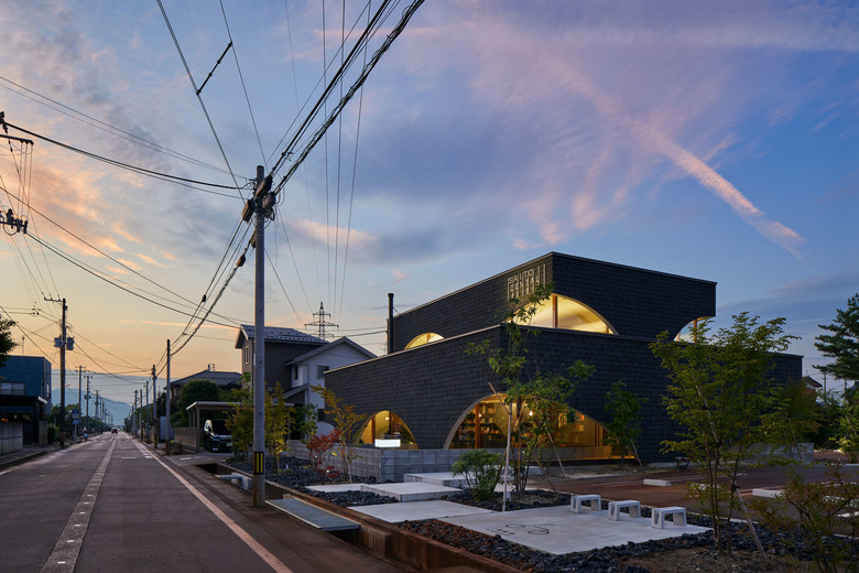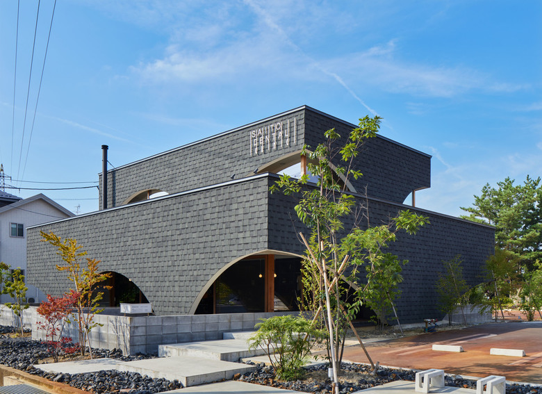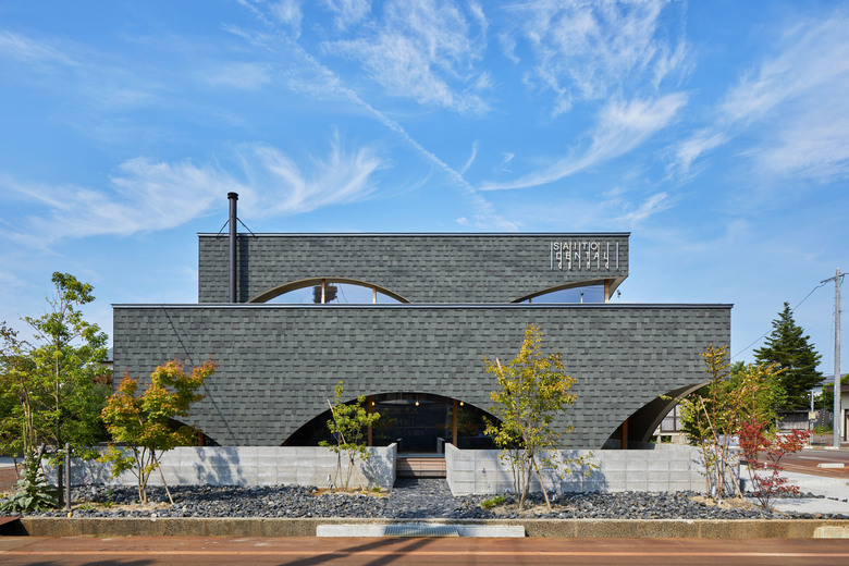 建物の大外に架けられた大きな帽子に開けられたアーチ開口がつなぐこちら側と向こう側。