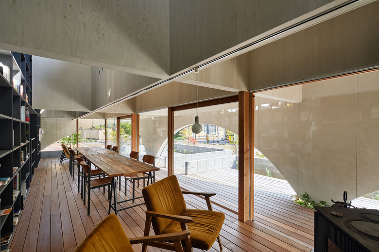 そのデッキステラスや庭には、それらを囲い込むように大きな帽子のような覆いが架けられ、それにより生まれる「屋外のような室内のような曖昧な領域/バッファスペース」が、