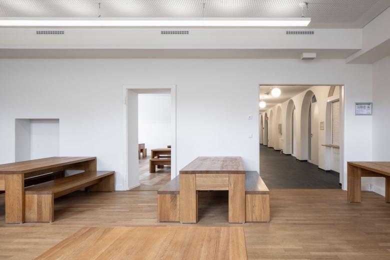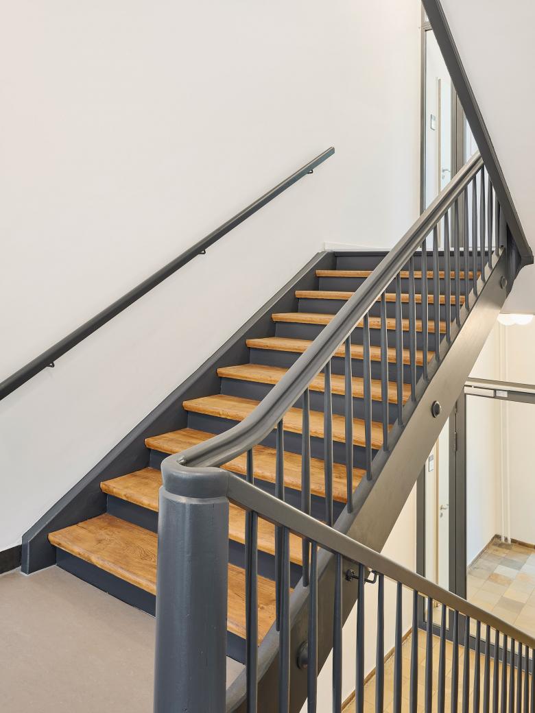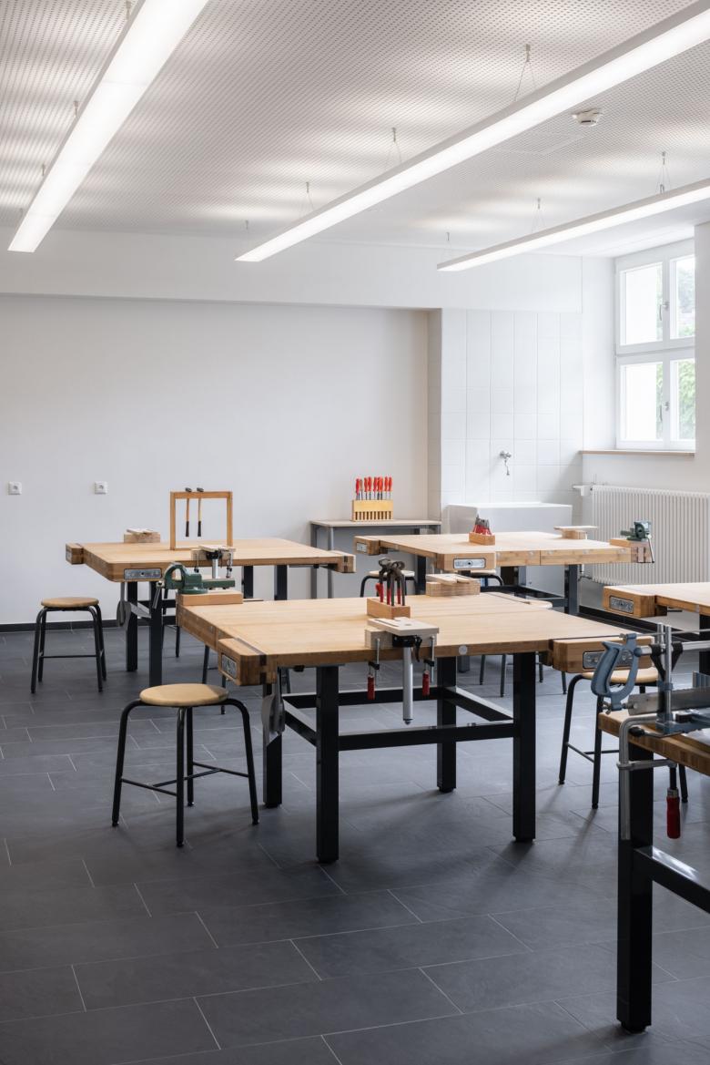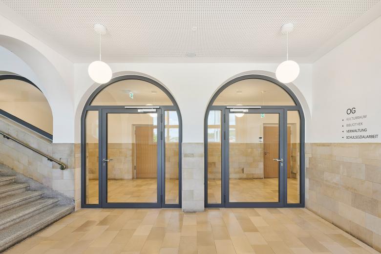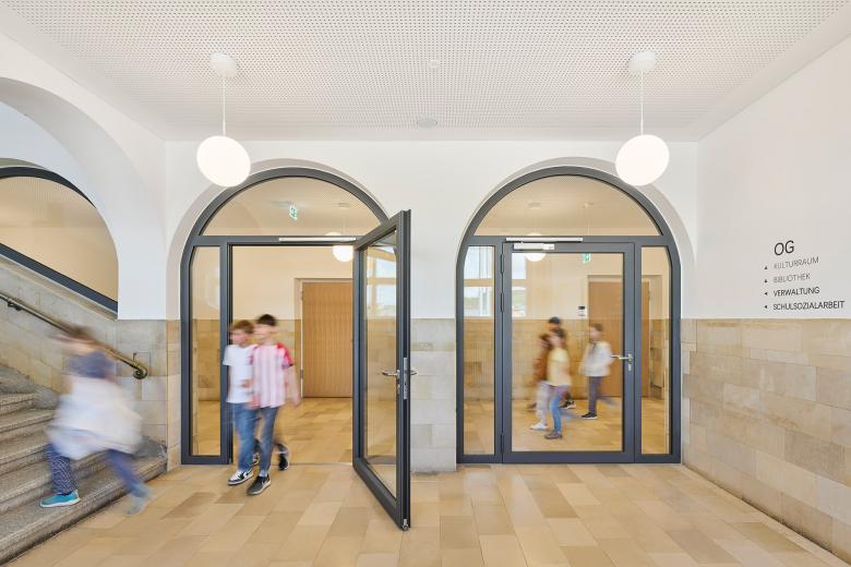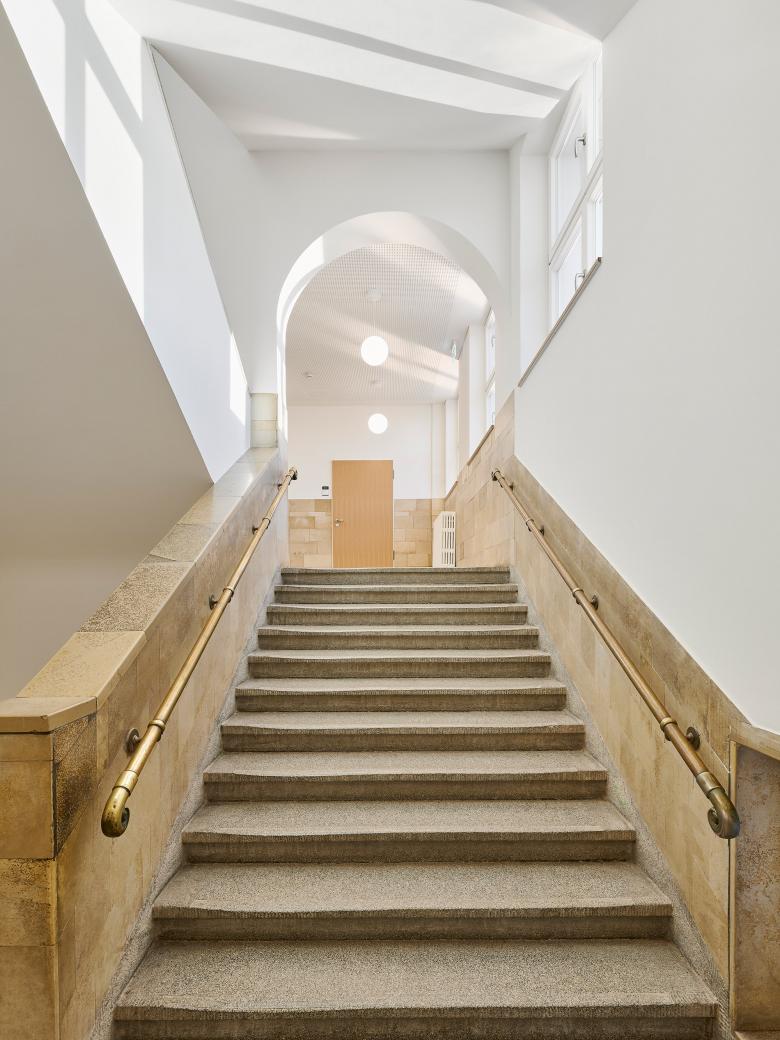 Durch die Sanierung und Erweiterung des Schulensembles entstand eine moderne, zukunftsorientierte Ganztagsgrundschule für rund 200 Kinder. Das Ensemble umfasst drei Gebäude: ein kleines Schulhaus von 1877 und ein größeres von 1927 – beide denkmalgeschützt – sowie den Neubau einer Einfeld-Sporthalle. Die Sanierung zeigt, wie sich historischer Bestand und heutige Anforderungen verbinden lassen. Neue Böden, Akustikdecken, Brandschutzmaßnahmen und barrierefreie Zugänge modernisieren die Schulhäuser – ergänzt durch zeitgemäße Möblierung und digitale Infrastruktur. Mit großer Sorgfalt wurden originale Elemente wie Fischgrätparkett, Rundbögen und Sandsteinflächen erhalten und restauriert.
