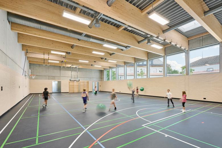 Ein saniertes Treppenhaus und neue Fluchtwege ergänzen die Gebäude funktional. Die neue Sporthalle mit begrüntem Dach, Klinkerfassade und Holztragwerk verbindet Nachhaltigkeit mit ansprechendem Design. Eine Photovoltaikanlage sowie eine mit Holzpellets betriebene Quartiersheizzentrale versorgen Schule und umliegende Gebäude mit erneuerbarer Energie. Das Gebäude dient sowohl als Sportstätte als auch als energetisches Herzstück des Quartiers.