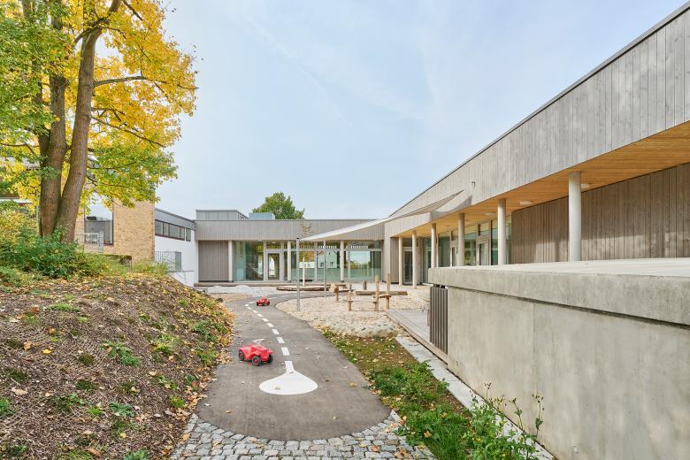 Besuchende betreten das Gelände über einen einladenden Zugang an der Ecke Königsberger Straße/Breslauer Straße. Die neugestaltete Eingangszone bildet einen freundlichen Auftakt zum Kita-Gebäude. Ein klarer, kinderwagenfreundlicher Weg führt rampenartig den kleinen Hang hinauf und leitet Eltern, Mitarbeitende und Kinder zum barrierefreien Haupteingang. Neue Parkplätze und eine Anlieferzone für das Mittagessen werten den Vorplatz funktional auf. Einen großen, imposanten Baum haben die Architektinnen und Architekten bewusst erhalten – er spendet im Sommer angenehmen Schatten. Gemeinsam mit einer Blumenwiese rahmt der Baum den Eingangsbereich natürlich ein. Die gesamten Außenanlagen wurden naturnah gestaltet und bewusst ohne trennende Zäune zur Straße hin belassen, sodass ein fließender Übergang ins Quartier entsteht.