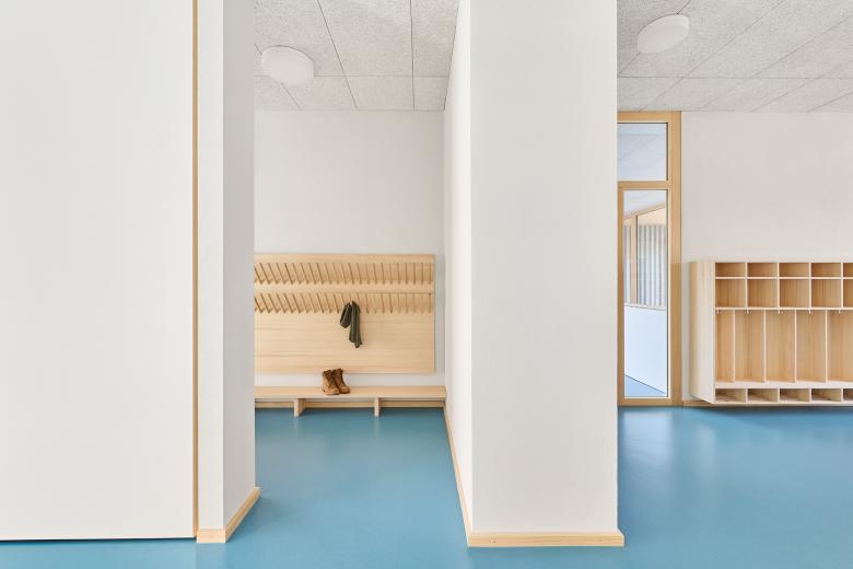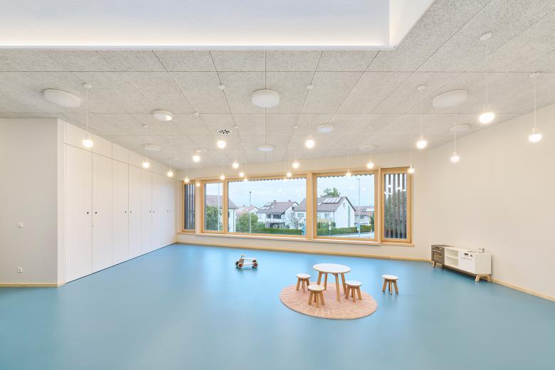 Im Gebäude setzen warme Holztöne, weiße Oberflächen, helle Wände und Decken sowie klare Sichtbetonflächen Akzente und schaffen eine freundliche Lern- und Spielumgebung. Das markante Türkis des robusten Kautschukbodens zieht sich als lebendiger Farbton durch das gesamte Gebäude und schließt auch die Treppenanlage ein. Die einzelnen Materialien fügen sich harmonisch zu einem stimmigen Materialkonzept zusammen und vermitteln einen schlichten und zurückhaltenden Gesamteindruck, den die Kinder lebendig und bunt bespielen. Akustikdeckenplatten aus Holzwolle dämpfen den Schall und schaffen eine angenehme Raumakustik. Ein durchdachtes Lichtkonzept kombiniert Pendel- und Scheibenleuchten mit individuell steuerbaren Lichtbändern, die verschiedene Beleuchtungsszenarien ermöglichen.