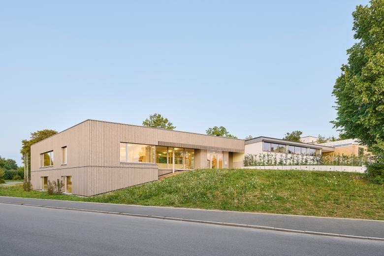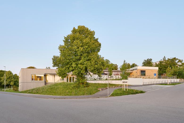 Der zweigeschossige, rund 1000 Quadratmeter große Erweiterungsbau der Kindertageseinrichtung Breslauer Straße in Bietigheim-Bissingen fügt sich harmonisch und überzeugend in die bestehende Struktur der umgebenden Wohnbebauung und die angrenzenden Schulflächen des Stadtteils Buch ein. Durch die behutsame Einbettung in die Topografie des Geländes entsteht eine architektonische und funktionale Verbindung zwischen den Bestandsgebäuden der Kita aus den 1950er-Jahren und dem Neubau. Die Erweiterung, geplant und realisiert durch THOMA. LAY. BUCHLER. ARCHITEKTEN BDA, wurde im Januar 2025 fertiggestellt und bietet Kleinkindern (U3 und Ü3) eine inspirierende Umgebung zum Lernen und Spielen. Der Entwurf verbindet ein helles, fröhliches und modernes Design mit den besonderen Bedürfnissen der kleinsten Nutzenden und schafft eine Umgebung, die Kinder ermutigt, ihre Welt spielerisch zu entdecken. Mit der Erweiterung wuchs die Kita auf fünf Gruppen - mit nun auch speziell gestalteten Bereichen für U3-Kinder.
