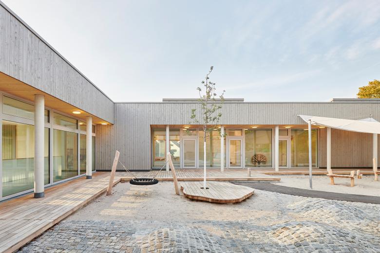 Betritt man den Neubau, so fällt die großzügige Raumgestaltung ins Auge. Hohe Decken und weitläufige Fensterfronten lassen viel Tageslicht in die Flur-, Gruppen- und Spielbereiche und fördern eine offene und kommunikative Atmosphäre. Große Glasflächen schaffen fließende Übergänge zwischen Innen- und Außenraum und bieten spannende Blickbeziehungen zur umgebenden Natur. Alle Gruppenräume im oberen Geschoss sind nach Norden ausgerichtet, während Oberlichter Licht aus dem Süden einfangen und zusätzliche Helligkeit bieten. Ein Erschließungsflur samt Schmutzschleuse verbindet die Gruppenräume mit dem nach Süden ausgerichteten Innenhof, der mit seiner überdachten Terrasse und einem U3-gerechten Spielbereich für die Kleinsten ausgebildet ist.