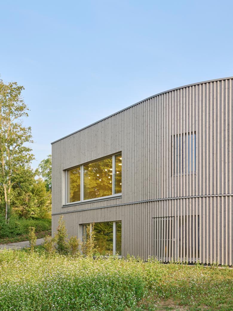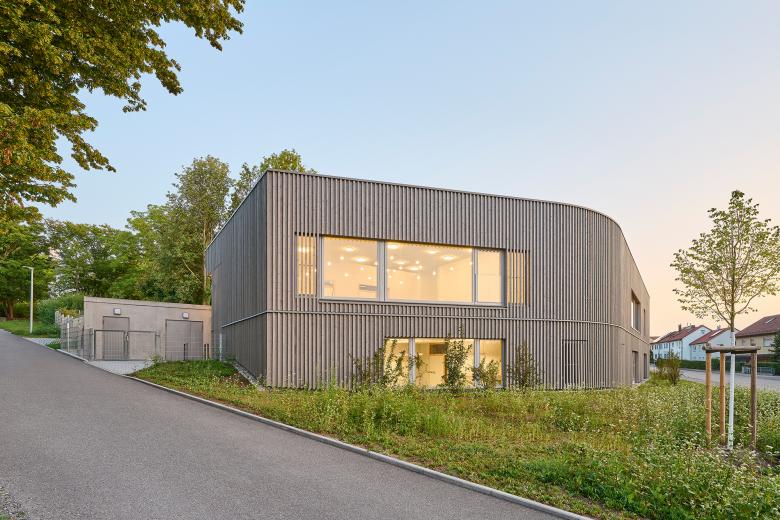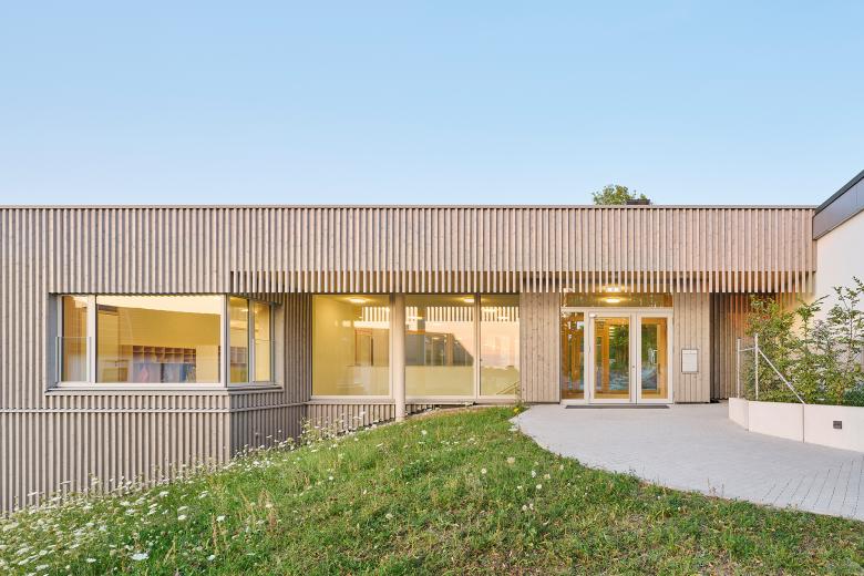 Die Bestandsgebäude, zwei kubische Baukörper aus gelblichem Stein und einem weiß gestrichenen Mittelteil aus den 1950er-Jahren, wurden bei laufendem Kita-Betrieb in Teilen saniert und umgebaut. Gemeinsam mit dem Neubau bilden sie einen geschützten Innenhof, der als abgeschirmter und sicherer Spielplatz für die U3-Kinder dient. Der neue Erweiterungsbau hebt sich bewusst von der Bestandsarchitektur ab und überzeugt mit einer geschwungenen Fassade aus vertikalen, vorvergrauten Holzpaneelen. Diese Lamellenstruktur reflektiert die natürliche Hanglage und erzeugt je nach Blickwinkel eine veränderliche Fassadengestaltung. Sie dient nicht nur als gestalterisches Element, sondern den Kindern auch als dezente und zugleich wirkungsvolle Absturzsicherung der großzügigen Fensterflächen der Gruppenräume. Die insgesamt gestaffelte Gebäudehöhe bewahrt die bestehende Struktur der Kita-Anlage und fügt sich sanft in die Hanglage ein.