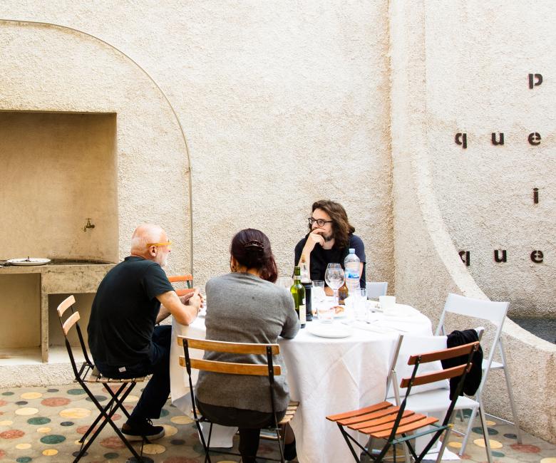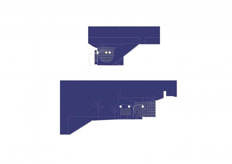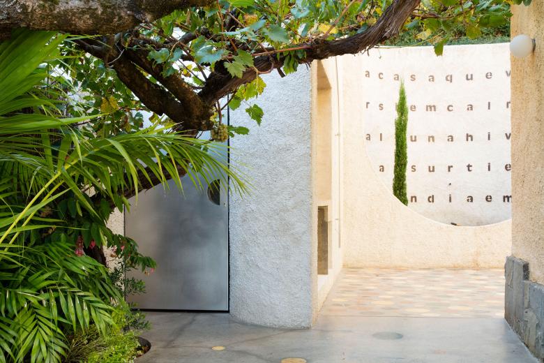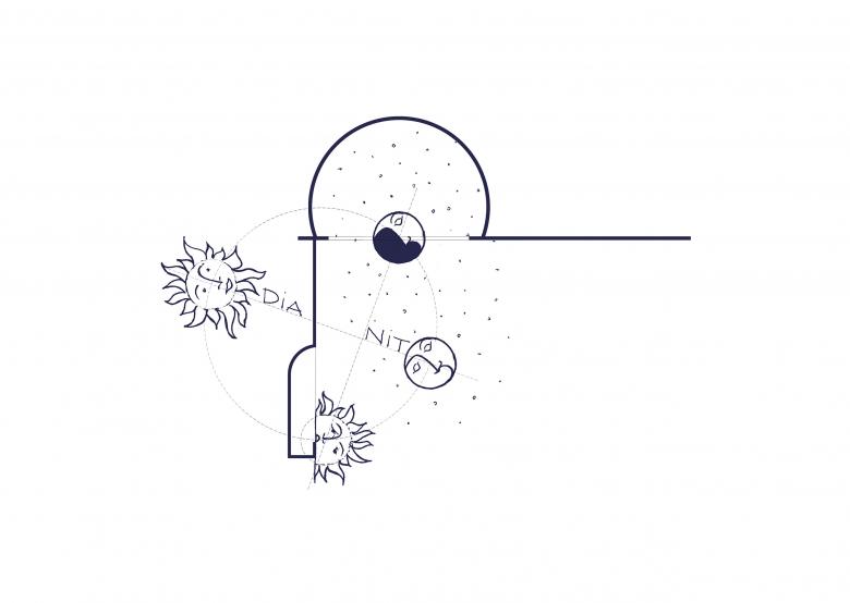 Una habitación exterior extiende el programa doméstico de una casa sombría, asentada en la cara norte de un volcán. La nueva estancia excavada tiene una planta rectangular, de dimensiones parecidas a la sala. Una parra la acabará cubriendo y como cualquier habitación tiene puertas y ventanas. La principal se abre a un patio semicircular con estanque; es una apertura al cielo, al sol y a la luna; es un patio del patio. Esta formalización ensancha el espacio entre la casa y la montaña, triplicando las horas que el sol que baña las piezas principales.