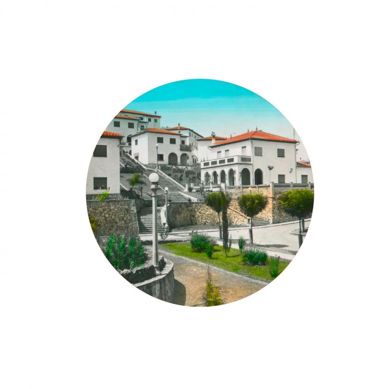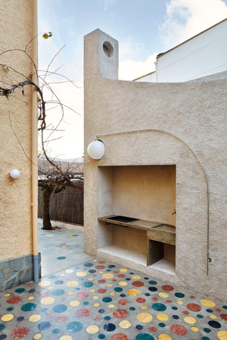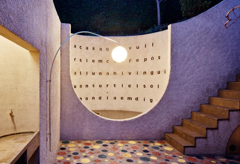 Un brazo curvado sostiene una luz esférica de 40cm que pivota sobre la estancia exterior. Dentro de la ventana pone en tensión el límite entre los dos espacios y hace que el patio semicircular actúe como una gran lámpara por reflexión. A medio recorrido, en el centro de la pieza, acompaña la actividad alrededor de la mesa. Situado contra la pared, el globo da una iluminación general y resalta la textura del revoco, característico del barrio de casas baratas de los años cincuenta.