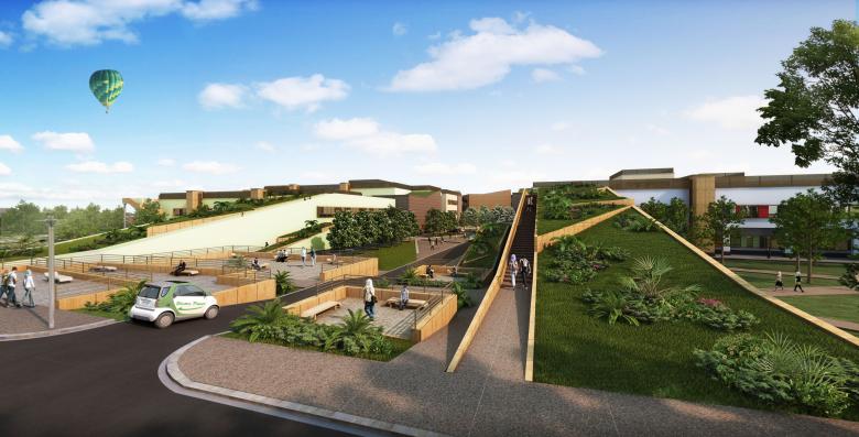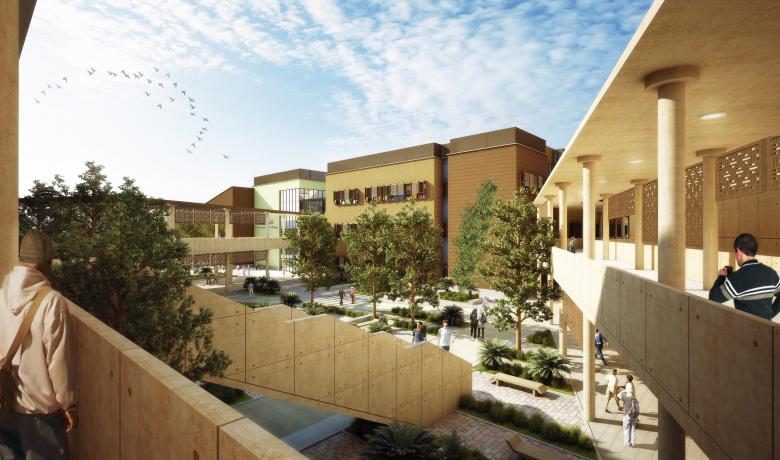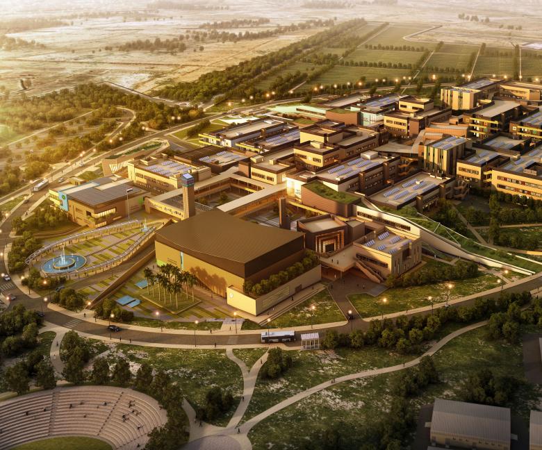 Il Campus è organizzato come una antica città: al centro si trova la piazza principale circondata dagli edifici più rappresentativi quali la Presidenza, la Biblioteca, l’Auditorium e la Moschea, poi i vari college; fuori dalla “cinta muraria”, la strada a forma di ellisse che definisce formalmente la “cittadella”, i campi con gli animali e gli altri servizi.. L’interno dell'ellisse è organizzato su più livelli: l’idea, già presente negli schizzi di Leonardo, è stata più volte esplorata come soluzione urbanistica in numerosi progetti quali quelli degli Smithson. I percorsi a più livelli in questo caso sfruttano la naturale depressione del terreno (una ex cava per la costruzione di mattoni), consentendo anche la creazione di numerosi percorsi ombreggiati e protetti e la divisione tra i percorsi ciclabili, delle auto elettriche e quelli pedonali.