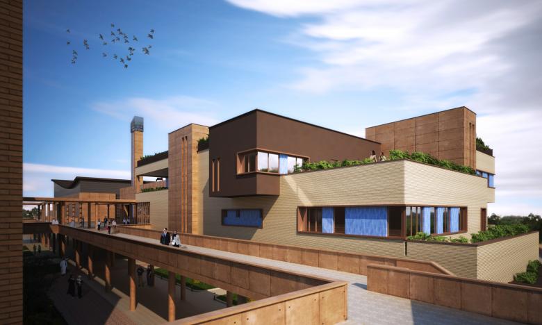 Il progetto architettonico si ispira a elementi storici e tipici locali: dalle architetture storiche, quali porta di Babilonia e dalle architetture locali provengono le piastrelle smaltate e i loro colori, l’uso dei mattoni gialli, le forme geometriche rettangolari.. L'utilizzo di calcestruzzo architettonico fa invece riferimento alla modernità locale: in Iraq il più importante campus universitario fu progettato da Gropius in un linguaggio modernista e brutalista. Altri aspetti progettuali decisivi sono stati il tener conto dell’orientamento solare, dei venti predominanti, dell’accesso principale e del possibile futuro collegamento con la ferrovia appena posta ad est del campus, dell’orografia del terreno.