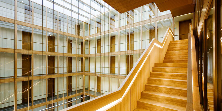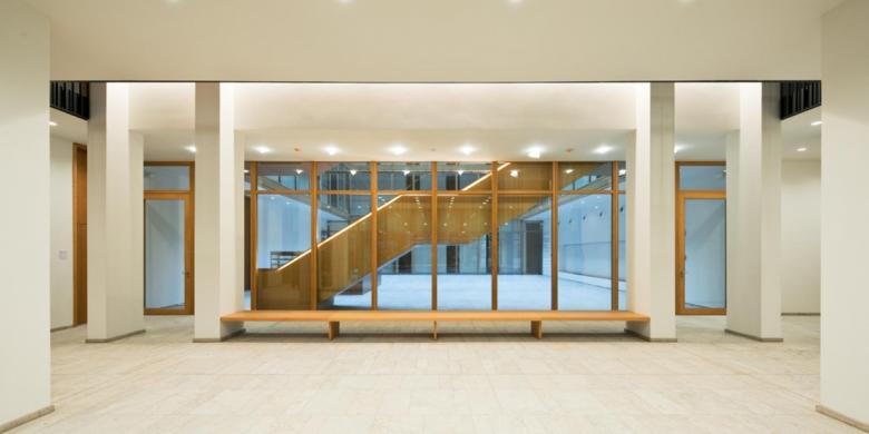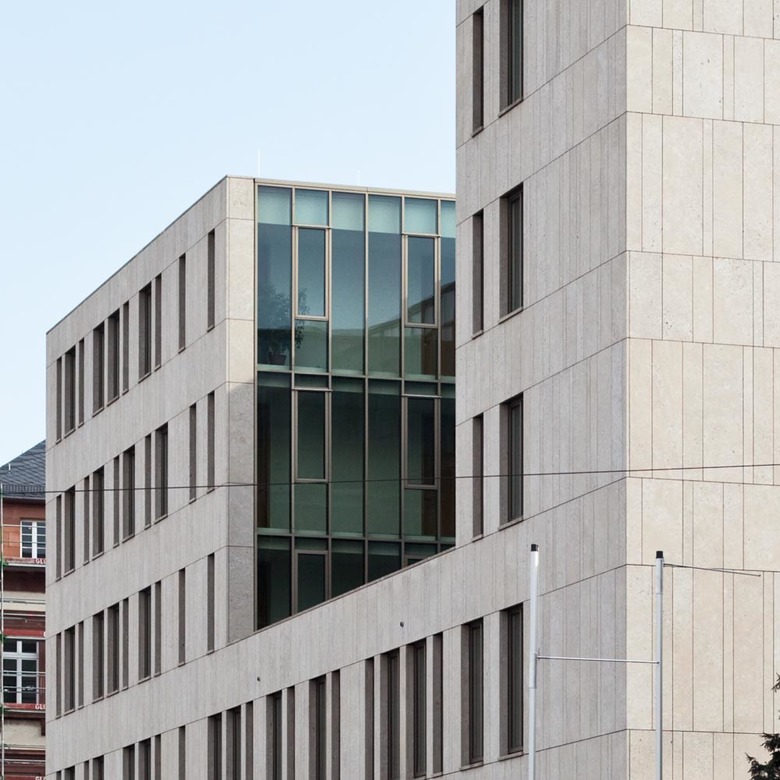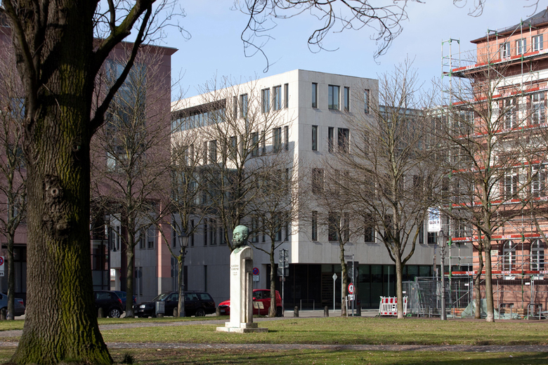 Der 5-geschossige Baukörper wird durch plastische Einschnitte, das Wegnehmen einzelner Volumen aus einem Quader, gegliedert. Es entsteht ein gleichwertiger Stadtkörper in der Reihe von Amts- und Landgericht, der die Maßstäblichkeit des angrenzenden Johannesviertels respektiert. Das 'Herz' und Orientierungspunkt des Gebäudes bildet die lichtdurchflutete zentrale Halle, und interpretiert so das Thema der Erschließungshalle im alten Amtsgericht neu.