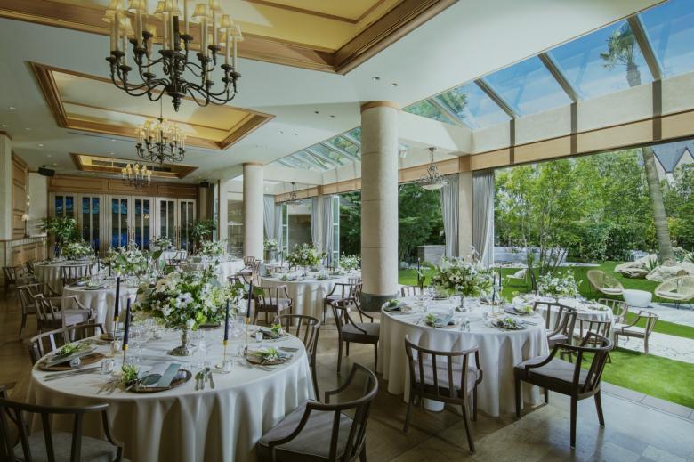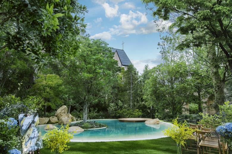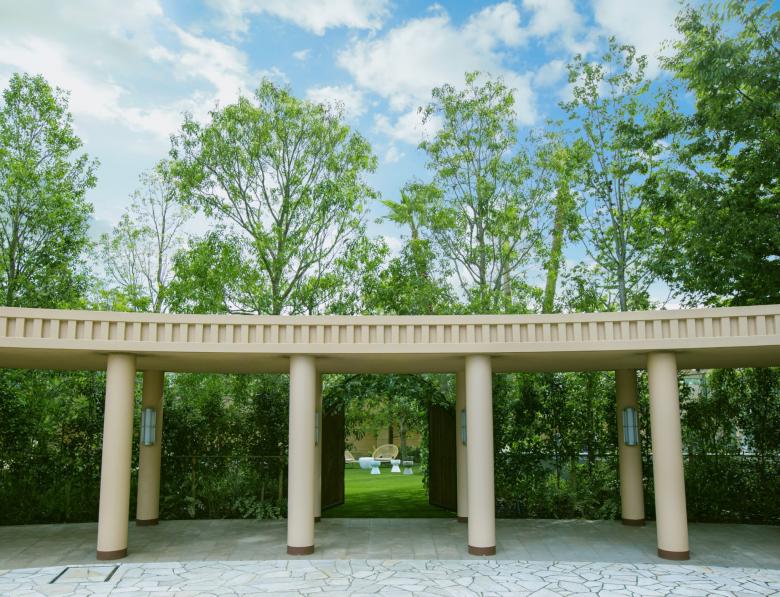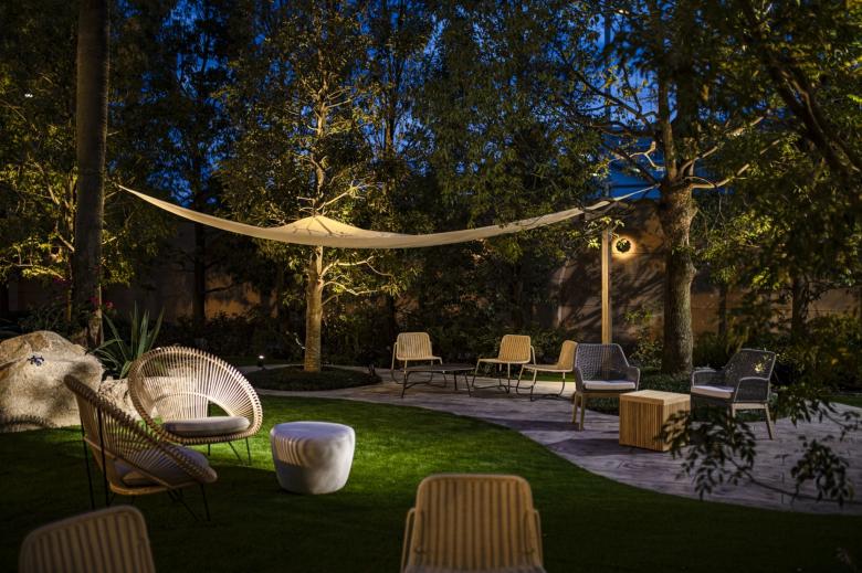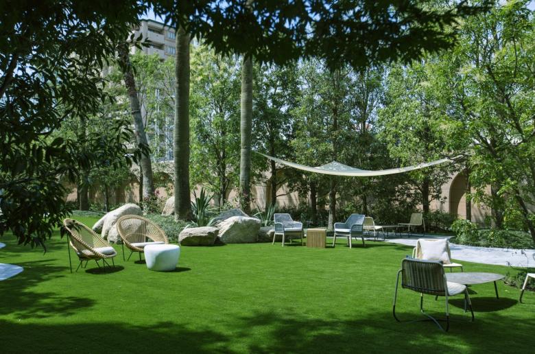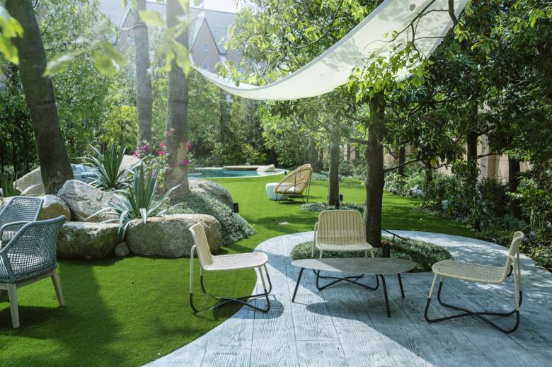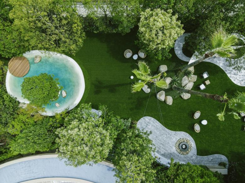 ガーデンのリノベーションで、まず意識したのが周辺環境と遮断する緑量である。また、南国の浅瀬の海のようなブルーグラデーションの池をつくり、アールの長いベンチやロサンゼルスの様なヤシや石を配し、海外のホテルにあるような空間を目指した。