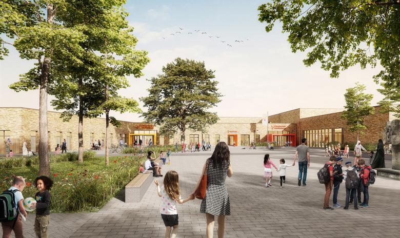 Die neue Grundschule integriert sich harmonisch in die umgebende Bebauung und fügt sich mit ihrer zweigeschossigen Struktur in das Umfeld der benachbarten Reihenhäuser und Wohngebäude ein. Durch Vor- und Rücksprünge entsteht ein dreiseitig gefasster Quartiersplatz zur Leuschnerstraße hin, während im Westen ein geschützter Pausenhof als Rückzugsort für die Schüler:innen dient. Die Bäume, darunter eine identitätsstiftende Platane, bleiben erhalten und werden durch grüne Inseln ergänzt.