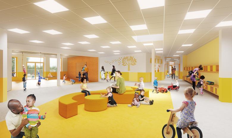 Der Stadtteil Mühlenberg im Süden Hannovers erhält mit dem Ersatzneubau der Grundschule ein zentrales Bildungs- und Gemeinschaftszentrum. Der Entwurf greift die kulturelle Vielfalt des Stadtteils auf und schafft einen interkulturellen Marktplatz als Ort der Begegnung. Dieser neue Begegnungsort stärkt die bestehenden Qualitäten der Umgebung und schafft einen geschützten und gleichzeitig offenen Raum, der die interkulturelle und inklusive Ausrichtung der Schule symbolisiert.