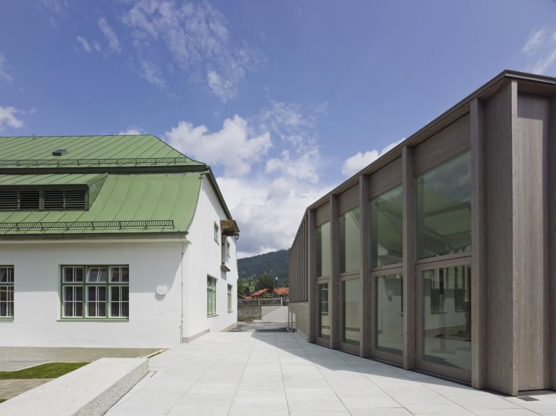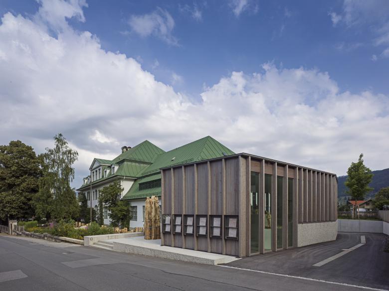 Ein Miteinander von massiven und hölzernen Bauten prägt das unmittelbare Umfeld der Schnitzschule. In Wechselwirkung zum denkmalgeschützten Hauptgebäude ist die Hülle der neuen Ausstellung als leichte Holzstruktur errichtet. Die polygonale Form reagiert auf die örtlichen Gegebenheiten und passt den Baukörper in die Umgebung ein. Das ruhige Erscheinungsbild lässt das Hauptgebäude weiterhin für sich wirken. Die regionale Tradition des Holzbaus sowie der Umgang mit dem Werkstoff Holz in der Schnitzschule wird im neuen Ausstellungsbau gegenwärtig.