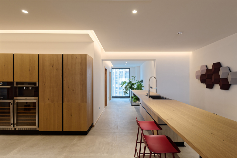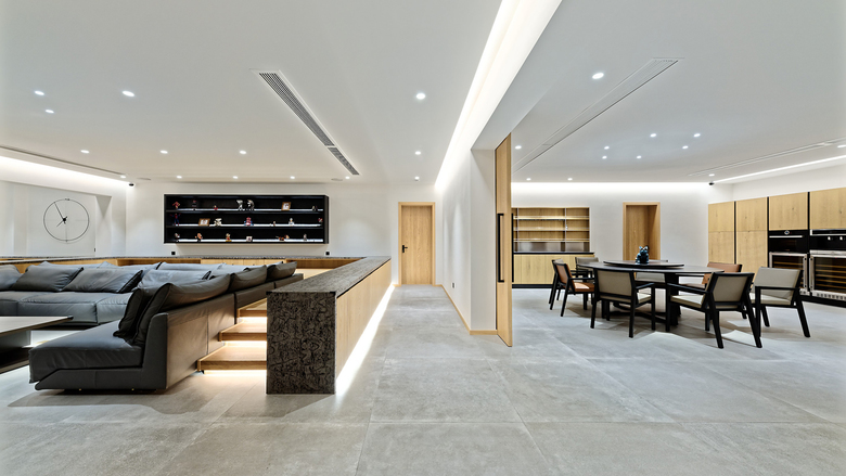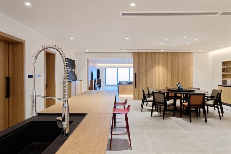 ダイニングに隣接する調理人用のバックキッチンとは別に、客と調理を楽しめるオープンキッチンカウンターも設けている。このカウンターはインナーガーデンのある窓際まで伸びている。窓がないダイニングルームとリビングとの間には3.8mの大きな木製引き戸を設置し、全て開くと、ダイニングとリビングを連続させることができるようにした。リビングのソファーとテレビ台の間のスペースはダイニング、キッチンへと続いており、リビング側の窓から反対側の窓までの23mの距離を突き抜けるように構成されている。リビングの上げ床、ダイニングテーブル、キッチンカウンター、書斎など広い空間の中で溜まりとなるような場所を設け、低く抑えた棚や、カウンターなどで、広がりがありながら、動きを明快に規定できる動線空間をつくり、緩急のある空間構成を目指した。