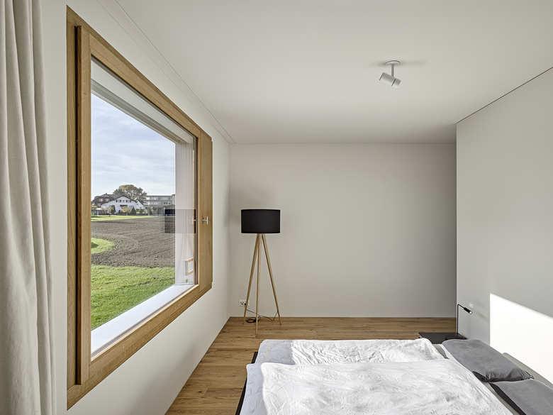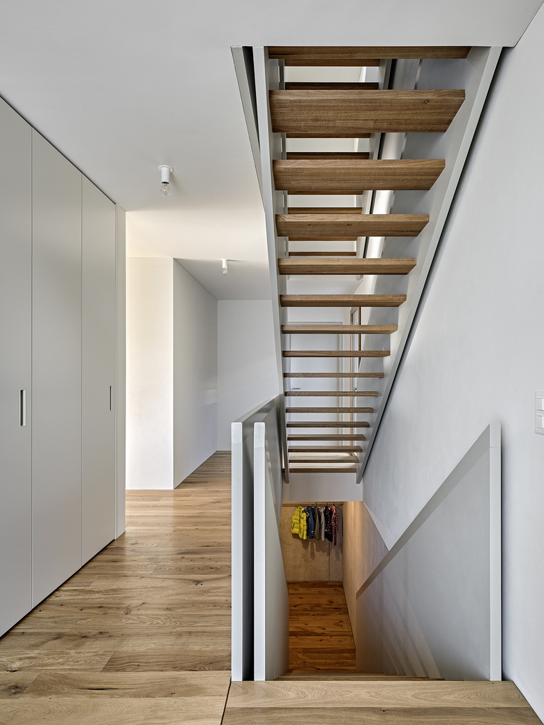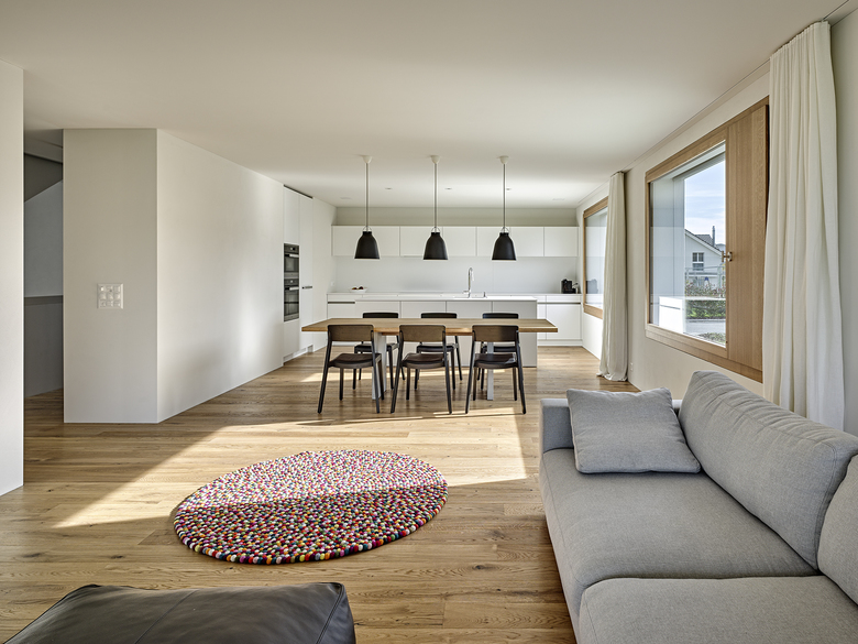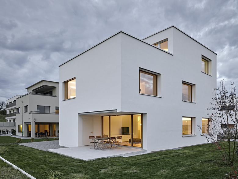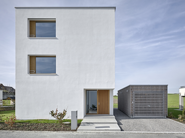 Das Einfamilienhaus wird als ruhiger, sorgfältig proportionierter Baukörper in ein heterogen wachsendes Neubauquartier gesetzt. Das kompakte Volumen des Massivbaus wird durch drei Einschnitte gegliedert, die den Eingang, den Gartensitzplatz und die Dachterrasse definieren. Die grossen Holzfenster sind so angeordnet, dass ein harmonisches Verhältnis aus geschlossenen Flächen und Öffnungen entsteht. Ihr gleichbleibendes, liegendes Format prägt die ruhige Ausstrahlung der Fassade. Die formale Reduktion und die Beschränkung auf wenige, aber sorgfältig umgesetzte Elemente sind die direkte Antwort auf die Aufgabe, für eine junge Familie ein Haus innerhalb eines engen Kostenrahmens zu realisieren. Im Inneren verbindet eine offene Holztreppe die Geschosse. Einfache aber wertige Materialien wie Eichenholz und mineralische Putze werden in Einklang mit hellen, abgetönten Oberflächen gebracht. Sie verleihen den Räumen Klarheit und Wohnlichkeit.