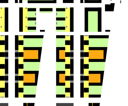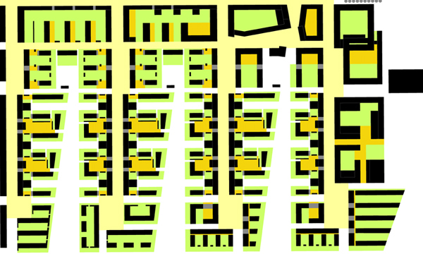 - Zwischen Stadtraum und Grünraum entwickelt sich der Wohnraum als ein abwechslungsreiches Bebauungsfeld verschiedener Hoftypen: Mit der Strasse verbundene Erschliessungshöfe wechseln mit zum Grünzug sich öffnenden Gartenhöfen.