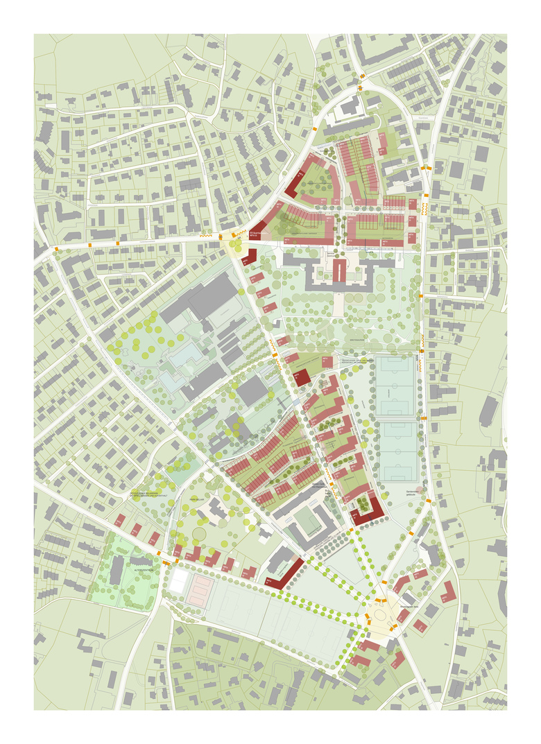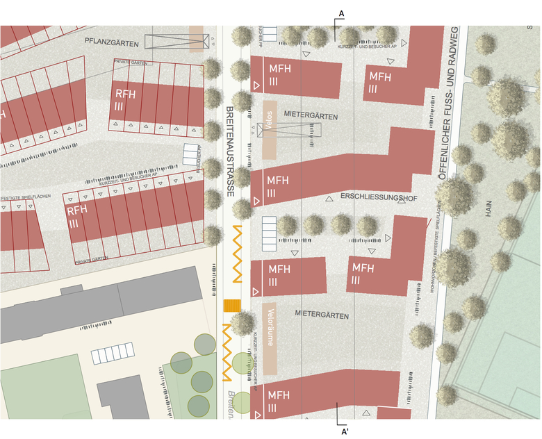 Vom Schützenhaus aus wird das Quartier strahlenförmig erschlossen. Unser Vorschlag entwickelt für jede Strasse einen eigenen Charakter: Die