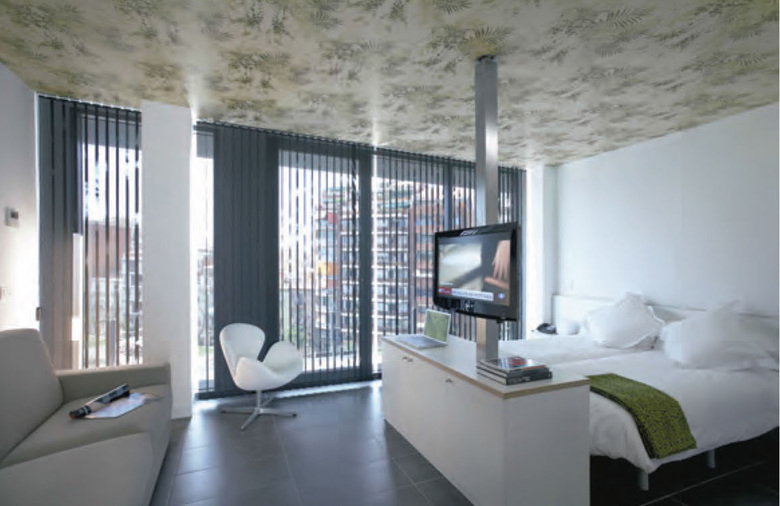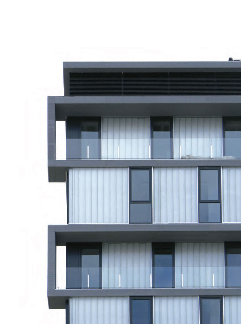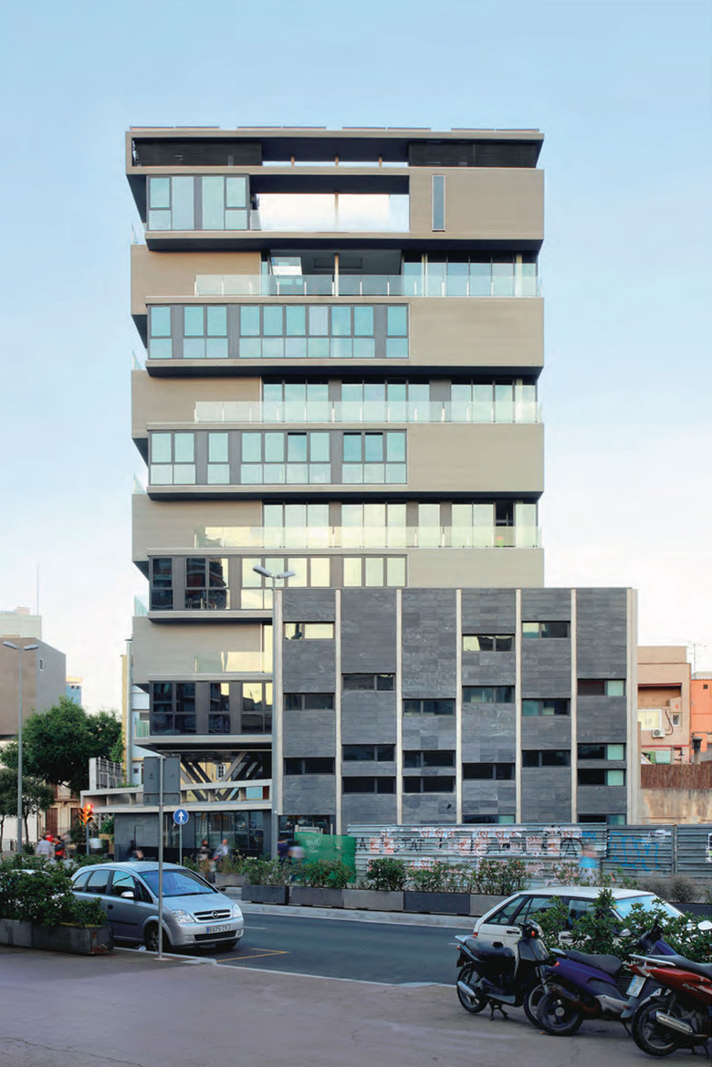A second building comprising three duplex apartments connects the building with the residential fabric of the Sants district. The facade of the tower consists of aluminum slats and U-glass elements. This tower is the first apartment building in Barcelona featuring an independent spring structure, which dampen vibrations caused by trains arriving at the station which pass close to the basement level.
