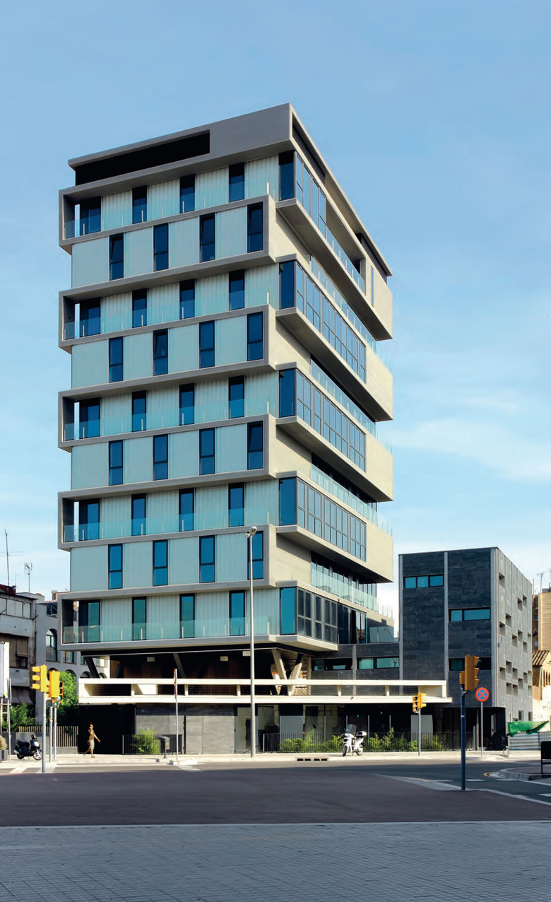 The proximity of the central Sants station places the project in a strategic location and makes it a landmark in the urban landscape. The planning regulations proposed a linear building featuring a 70m facade along the promenade. The solution adopted, however, straightens this built-up barrier and transforms it into a square ten-story tower. This frees up the ground-level space required to create a ramp and stairs to connect one side with the other, while creating a neighbourhood courtyard.