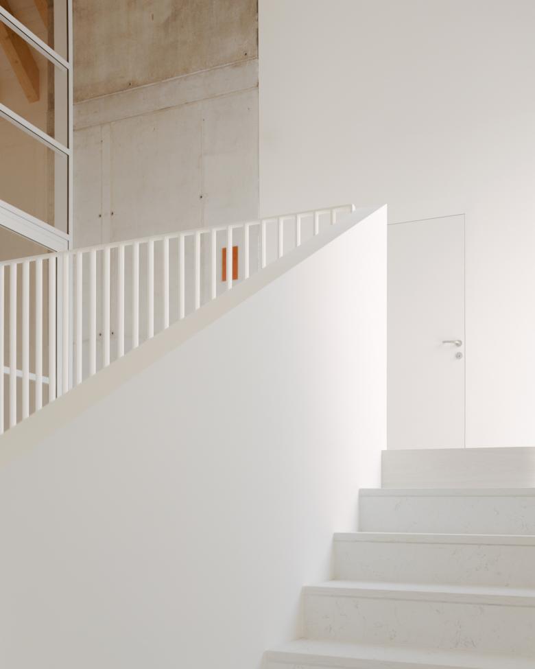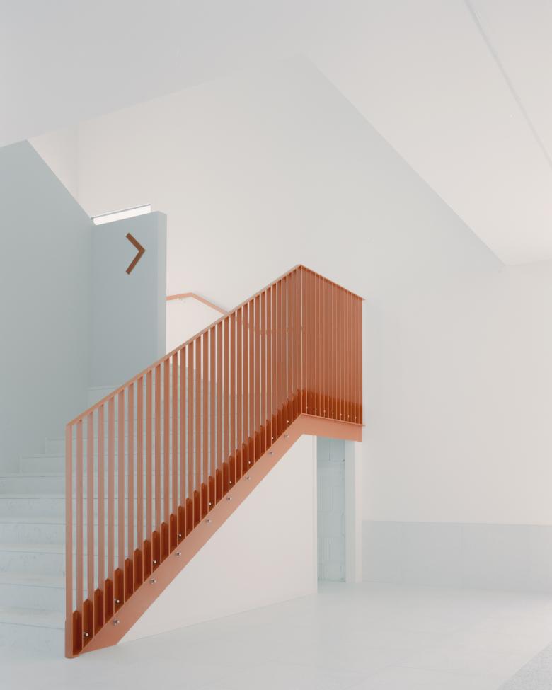 The lower building stands on the opposite side from the road and with its retreat defines the public space, which is further clarified by the presence of the samll garden.