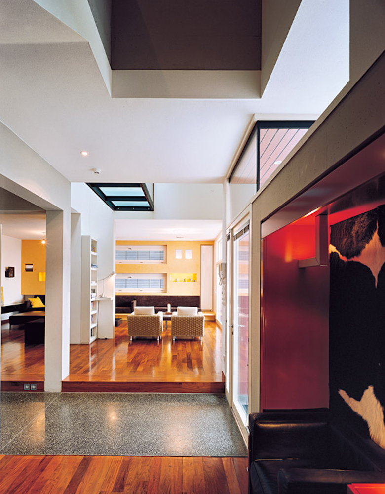 Die Organisation erfolgt auf drei Ebenen, wobei die unterste Garagen, Antritt und Technik (Stauzonen), die mittlere das Wohnen aufnimmt und das Ruhen in der dritten erfolgt. Das Dach kann als Sonnendeck verwendet werden. Eingang, Bewegungslinien und Vorplatzterrasse binden das Haus in die Landschaft ein.