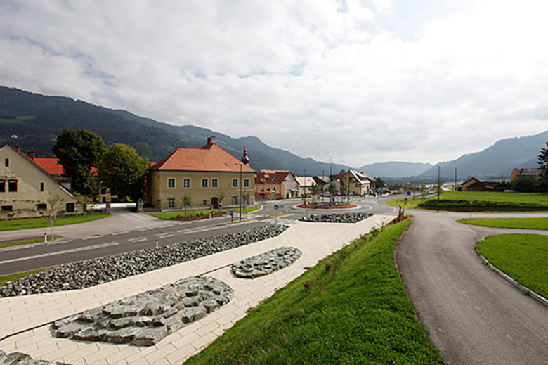 Wie der Fluss ist die Strasse ein Transportmittel und ein Synonym für Leben. Wo Strassen sind, ist auch Leben...an ihren Ufern breiten sich Ortschaften und Städte aus, die von ihr gespeist werden... dem Bild des "Gewässers" folgend, sollen die neuen Abschnitte der Bundesstrasse als ein Strom gesehen werden, der in den Ort hineinströmt, um sich in ruhigeren Verästelungen auszubreiten, bis auch das letzte Haus erreicht ist. Umsäumt von den umliegenden Bergen bilden die Strassen im Ortsbereich eine Art "seichte Stelle in einem Flussbett", das bewandert und überquert werden kann. Feine Verästelungen bilden thematischen Rahmen für Wege und Plätze. Überwucherung/ Verzahnung: Die Verzahnung zwischen künstlicher Landschaft (Strassen, Ortschaft) und natürlicher Landschaft (Umgebung, Murtal) überwindet die Trennung der Ortschaften durch die Strasse. Durch die Neuinterpretation der Strasse als natürlichem Element und Teil der Landschaft können die Restflächen der neuen Strassenabschnitte wieder nutzbar gemacht werden. Beide Orte können ihre Trennung überwinden und sich über die Strasse hinweg weiter entwickeln. Die Strassen wachsen in die Ortschaften ein. Die Restflächen, die durch die neue Strassenführung entstehen, werden als verbinderder Grün-raum angelegt.