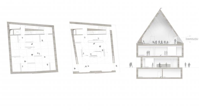Im Kontext der Körnigkeit des Bestandes mit seiner vorwiegend traufständigen Bebauung greift der Entwurf die vorhandene Gebäudetypologie auf, bzw. beschäftigt sich mit der gestalterischen Transformation eines archaischen Hausgrundtypus für das Galeriegebäude.