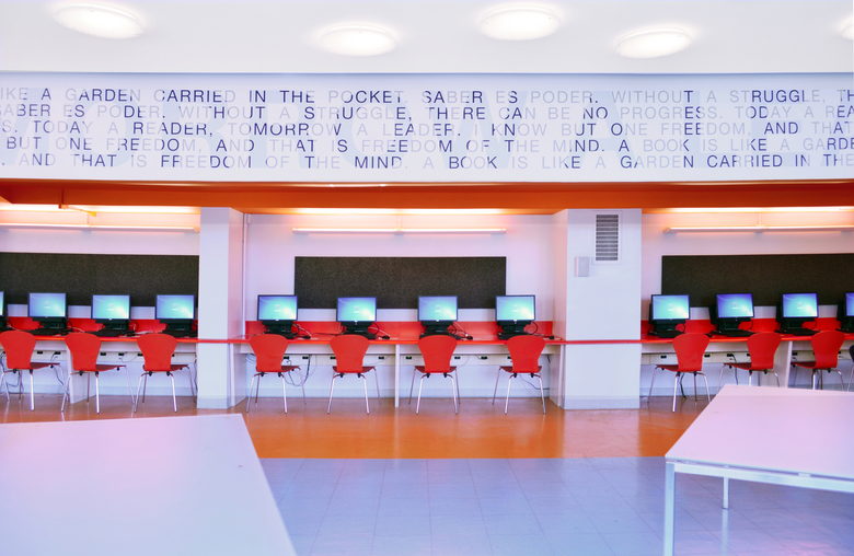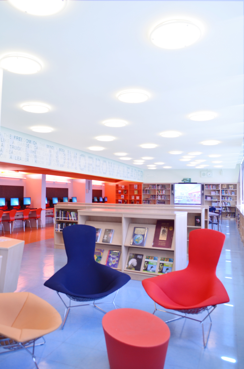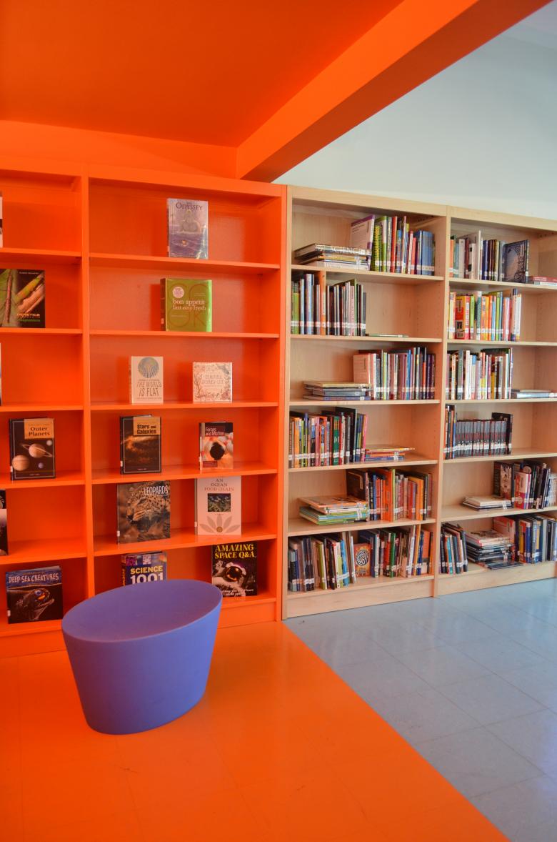APT introduced a bright orange ribbon of alcove along the library's interior wall, surmounted by a custom designed graphic of favorite quotes chosen by the school. The orange alcove is the computer area, while the main space, flooded by natural light, is divided with low furniture elements that provide classroom and lounge areas. The sequence of spaces is articulated by modular and movable furniture that allows flexibility of use for composing study, meeting and discussion areas for students, teachers, and parents alike.
