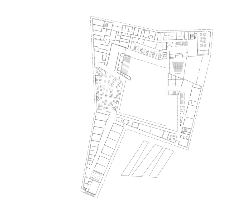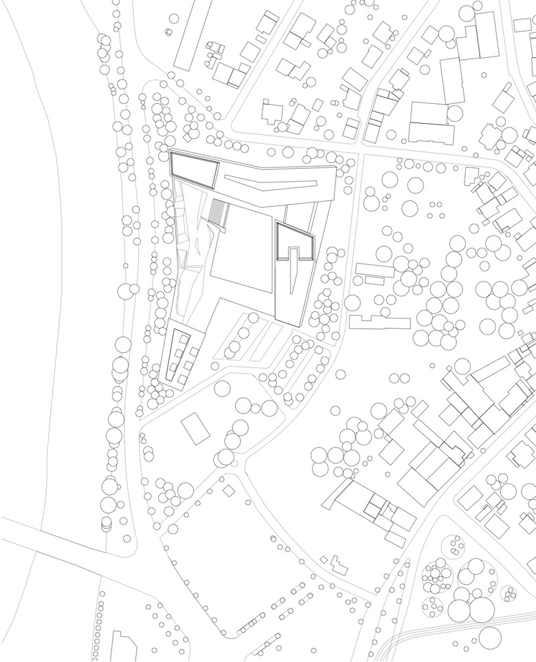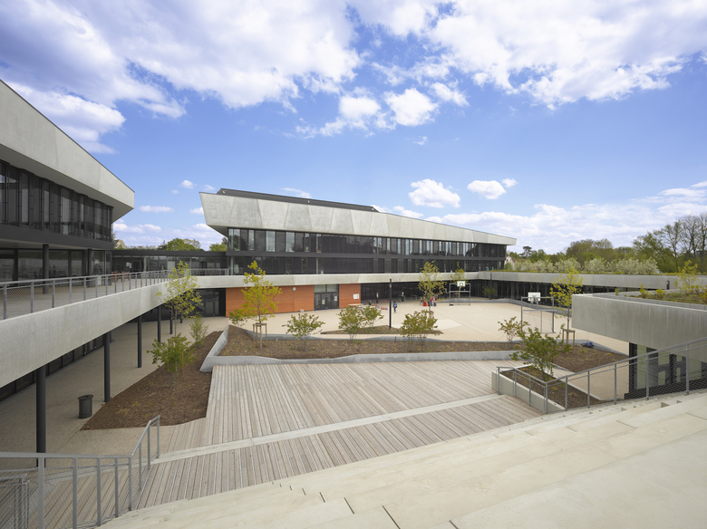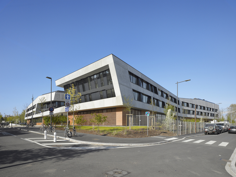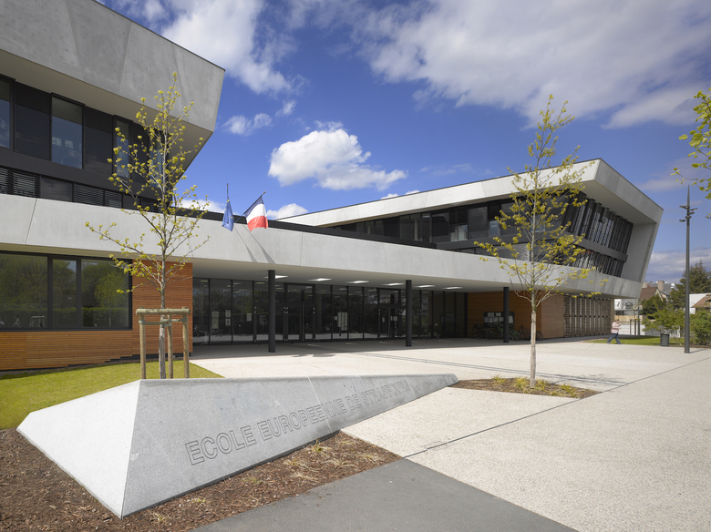Das Schulgebäude liegt auf einem Grundstück mit dichtem Baumbestand. Die drei klar ablesbaren Baukörper des Kindergartens, der Grundschule und des Gymnasiums gruppieren sich um einen zentralen Innenhof. Im Erdgeschoss befinden sich die gemeinsam genutzten Bereiche, wie Bibliothek, Multifunktionssaal und Mensa. Trotz der Differenzierung der Funktionseinheiten fasst eine durchgängige, plastisch geformte Fassade die Baukörper zu einem gemeinsamen Ganzen zusammen, wodurch das Leitbild des neuen Typus der „Europäische Schule“ klar hervortritt: Gemeinsamkeiten leben und kultivieren.