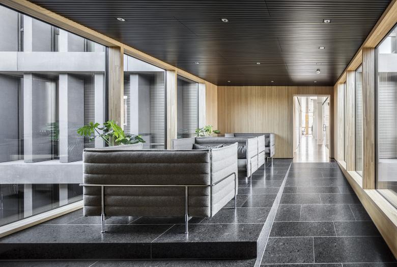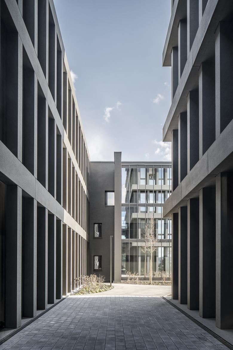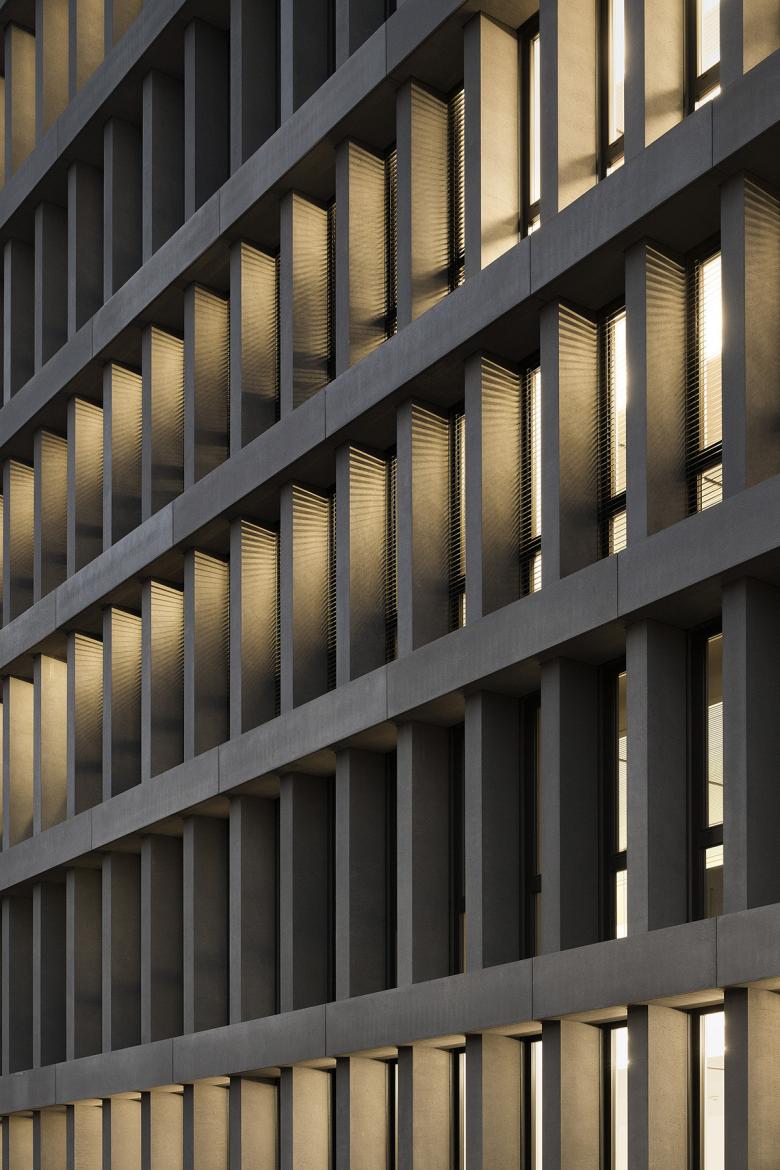 KNOLL Maschinenbau ist ein global player mit über tausend Mitarbeitenden. Im neuen Headquarter arbeiten 200 Menschen, Tendenz steigend. An die räumliche Expansion wurde in der Planung gedacht. Die Marke repräsentiert Kraft, Präzision und Klarheit. Unternehmenswerte, welche die Architektur aufnimmt und in einen klaren Gebäuderaster einbringt. Der fünfstöckige Büroturm setzt sich in einem Wald von Bäumen in Szene, die Produktionshallen ordnen sich unter. Die Ordnung ist somit harmonisch hergestellt. Der Materialeinsatz orientiert sich an edlen Qualitäten. Die Fassade, in elementförmigem Sichtbeton, ist mit einem ökologisch