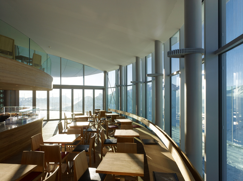 Auf 3429 Meter über dem Meer liegt die höchstgelegene Bergstation in Österreich. Die neue Wildspitzbahn ersetzt die in die Jahre gekommene Panoramabahn und erweitert das kulinarische Angebot mit dem Café 3.440. Die einzigartige Aussicht in die Alpen ist der Ausgangspunkt zu allen Überlegungen und zur gewählten Formensprache. Die Konstruktion - formabhängig, entsteht aus den natürlichen Rahmenbedingungen und der technischen Machbarkeit. Geringste Aufstandsflächen, Gletscherzunge, steil abfallende Bergseiten und die extreme Höhenlage mit entsprechender Sonneneinstrahlung, Wind und dünner Luft, schränken die Spielräume stark ein. Eine Stahl-Alu-Konstruktion auf die bestehenden Fundamente abgestellt, bildet die Basis für eine Form die auf die Aussicht einerseits und die Witterungsbedingungen andererseits reagiert. Das Gebaute fügt sich in die Formenwelt der ganzjährig bestehenden, von der Natur hergestellten „Schneearchitektur“ ein. Soweit der Ort Zurückhaltung machbar macht tritt der Bau zurück, um vordergründige Überheblichkeit im Anblick der Mächtigkeit der Naturlandschaft zu vermeiden.
