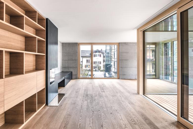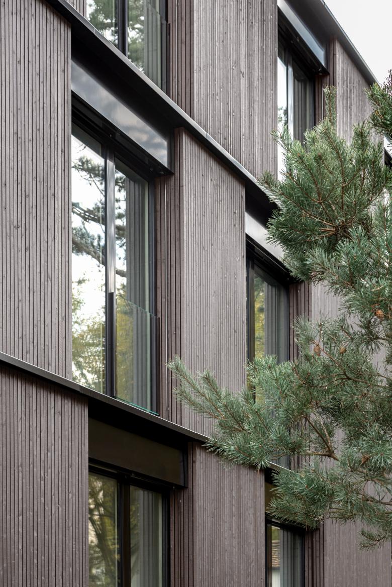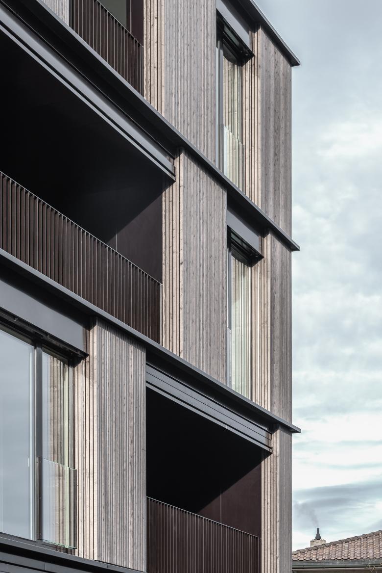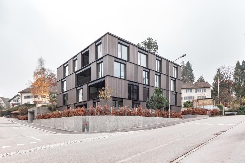 Das Grundstück sieht einen quadratischen Punktbau vor. Die eingezogenen Loggien bewirken eine klare Architektursprache. Der Punktbau bewirkt auch eine wesentlich bessere Verteilung der halbprivaten und privaten Außenräume. Nördlich der Wohnanlage entsteht ein Spielplatz und trotzdem bleibt der Garten der Eigentümer im Erdgeschoss großzügig. Das Gebäude wird in Massivbauweise gebaut. Die Hülle bildet eine geflammte Holzlattenfassade die vorgehängt wird. Die klaren Linien des Gebäudes werden in der Umgebung durch weiche Formen umspielt. Der Garten wird weich und natürlich. Ziel ist es die Fichte und die Föhre im nördlichen Teil des Grundstückes zu erhalten. Mit Gräsern, Buchshecken und heimischen Bäumen wird der Garten gestaltet.