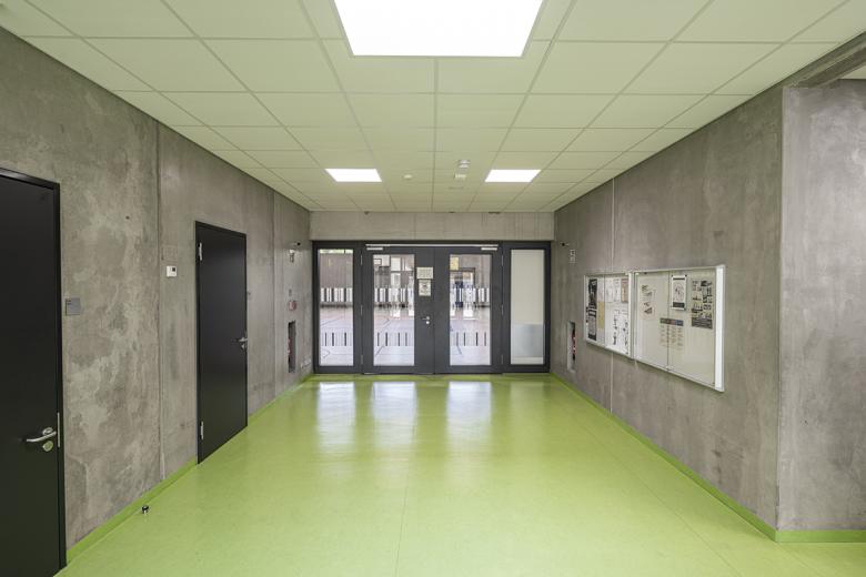 Am Schulstandort in der Haeckelstraße in Potsdam West teilen sich bisher die Zeppelin-Grundschule und das Hannah-Arendt-Gymnasium die bestehende, sanierte Einfeldhalle. Das Baufeld auf dem Grundstück, zwischen bestehender Halle, Plattenbau-Wohngebiet und Bahndamm, soll die neue Zweifeldhalle, eine 100m-Laufbahn und eine Kugelstoßanlage aufnehmen. Nach einer Standortanalyse mit Variantenvorstellung stand fest, dass die durch das Baufeld verlaufende Fernwärmetrasse verlegt werden muss. Die neue Halle wird nördlich der bestehenden Bebauung angeordnet, so dass sich im Ensemble mit dem Bestand und dem zu errichtenden Hartplatz eine stimmige Hofabfolge ausbildet. Die entstehende Erschließungsachse entlang der Bestandshalle führt direkt ins Foyer des Neubaus. Die Umkleiden sind barrierefrei und rollstuhltauglich geplant, die Halle wird gemäß der Nutzeranforderung dreiteilbar ausgeführt, für die nutzenden Vereine wird ein eigener Geräteraum vorgesehen. Die robuste Optik der geplanten Sichtbeton-Fertigteilbauweise wird durch die farbige Boden- und Wandgestaltung befreit. Die Fassade wird mit Faserzementplatten in einem dezenten Farbspiel von Grün- und Erdtönen verkleidet, der Sonnenschutz im Süden mit Lamellen aus Faserzement ausgeführt.