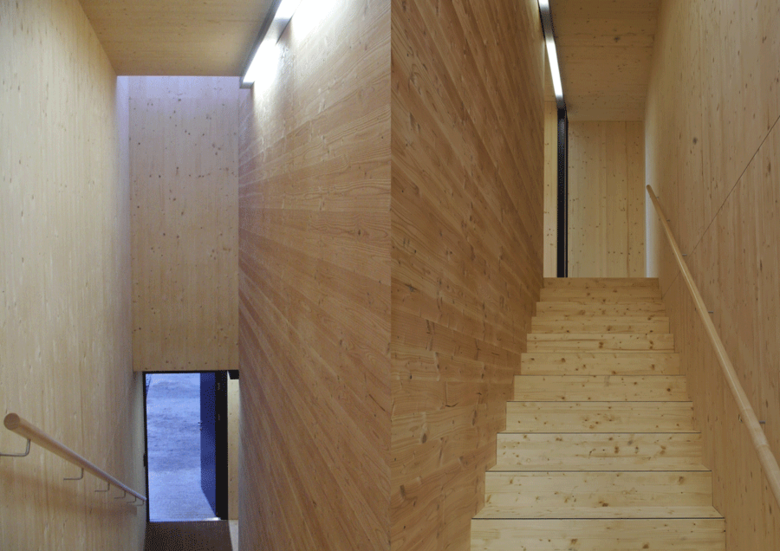 Anstelle eines zunächst vorgesehenen Anbaus an das bestehende Fachwerkhäuschen wurde ein freistehender Baukörper entwickelt, der Bezug nimmt zum Bestand und zu seinem Umfeld, indem er die Proportionen und die Materialität der umgebenden Gebäude aufnimmt, gleichzeitig jedoch mit seiner modernen Formensprache in Kontrast dazu steht. Heute markiert der Erweiterungsbau auch den Übergang zum Freispielbereich, ohne den Bestand davon abzutrennen. Dies wird unter anderem durch die nach außen markant in Erscheinung tretende Treppe erreicht, die sich in ihrer Bewegung zum Freibereich hin öffnet und in diesen überleitet. Im Inneren ermöglicht die Treppe einen Wechsel in der Orientierung der Gruppenräume.