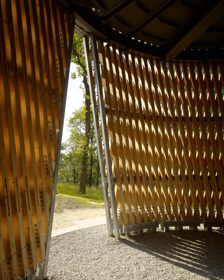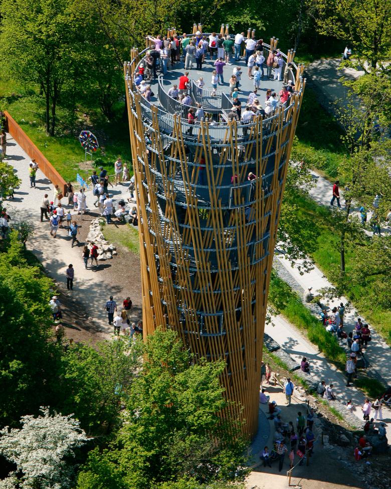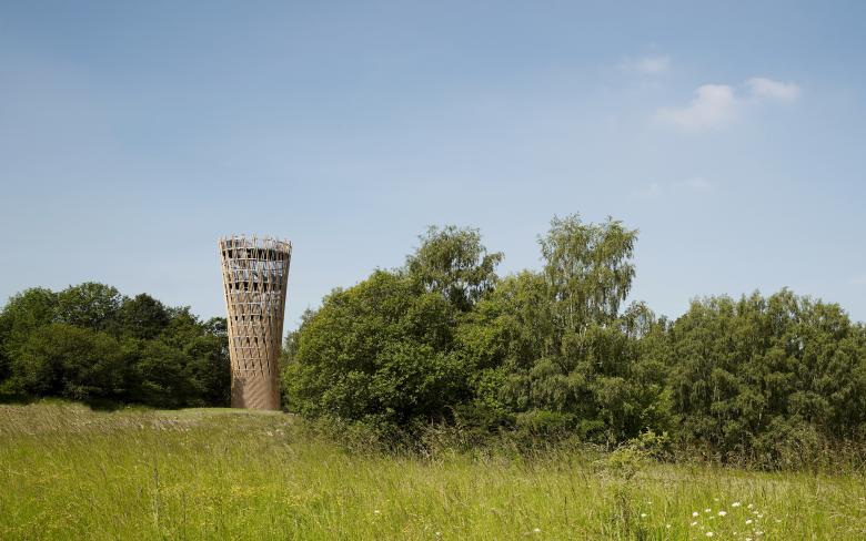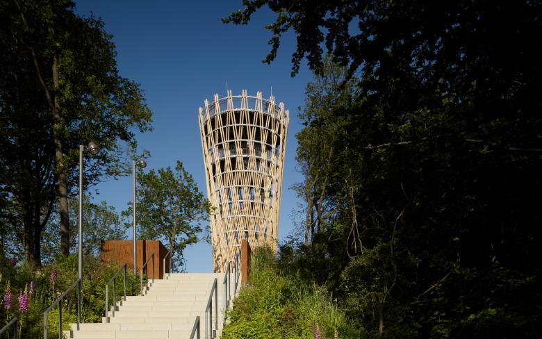 Der Aussichtsturm am Jüberg, weit sichtbar am Ende einer langen Treppen prominent positioniert, markiert den Endpunkt der Stadt und den Übergang in die Landschaft. Die sich nach oben weitende Form des Turms reagiert unmittelbar auf die örtlichen Begebenheiten mit bewaldetem Jüberg, städtebaulicher Achse und 360 Grad Rundumsicht. Die Konstruktion des Bauwerks basiert auf dem Prinzip des Hyperboloids, das von Ingenieur Vladimir G. Suchov (1853 – 1939) vielfach für Stahlkonstruktionen angewendet wurde. Sie besteht aus einem Stabwerk aus Brettschichtholz (BSH) Lärche mit insgesamt 240 geraden Hölzern mit einem Querschnitt von 8 x 8 Zentimeter. Durch Schrägstellen zwei gegenläufiger Stabebenen entsteht eine großmaschige Netzstruktur. Auf weitere vertikale Elemente wie beispielsweise Stahlstützen oder aber einen zentralen Mast wurde konsequent verzichtet.