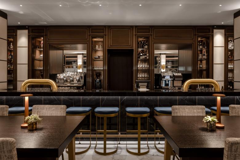 Goddard Littlefair inszeniert mit schwarzen Fliesen in Marmoroptik, dunklen Holzverkleidungen, gespiegelten Bodenfliesen und Gold schimmernden Messingelementen einen klassischen, modernen Look, das dank einer durchgehenden neuen Deckenflucht im Gesamtbild nun leichter, heller und einladender auf die Hotelgäste wirkt. Der lange und offene Tresen tritt optisch für Besucher als markantes Highlight in den Vordergrund. Die Möbel kombinieren Metropolitan Glamour mit rauem, klassischem Schick.