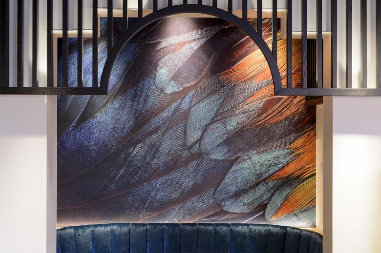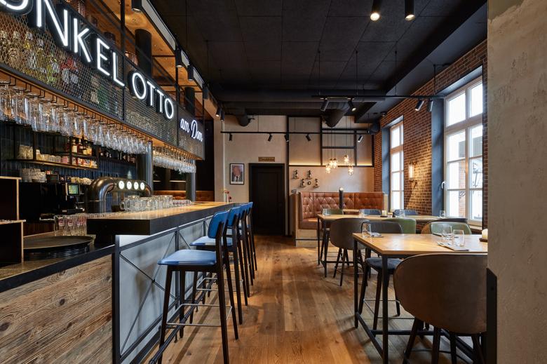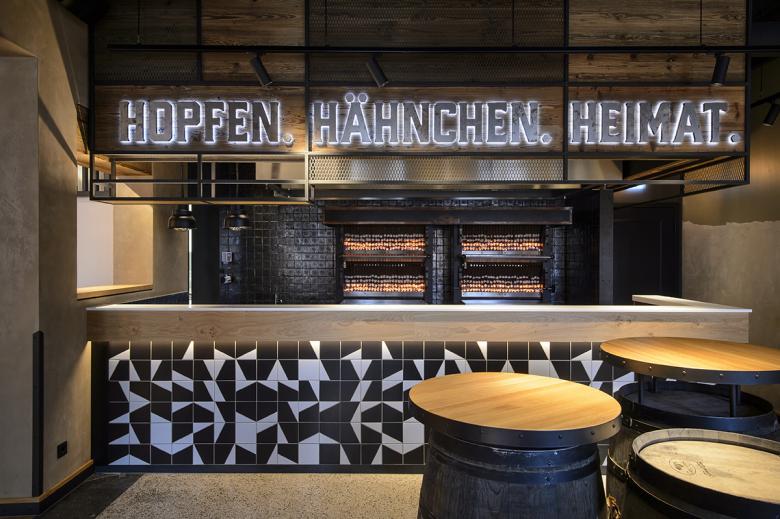 Der Restaurantbereich mit dem einstigen „Vorstandszimmer“, die neu gestaltete Gaststätte und die Braterei bieten zusammen 107 Plätze. Beim Eintreten fällt der Blick sofort auf die Leuchtschrift „Hopfen. Hähnchen. Heimat.“ über dem Tresen und die zehn Quadratmeter große Feuerwand, an dem das Geflügel am offenen Feuer zubereitet wird. Damit sind die Themen gesetzt: 40 Sorten Bier und bestes Kikok-Hähnchen von der Rotisserie gepaart mit uriger und heimatverbundener Kneipenkultur in moderner Interpretation.