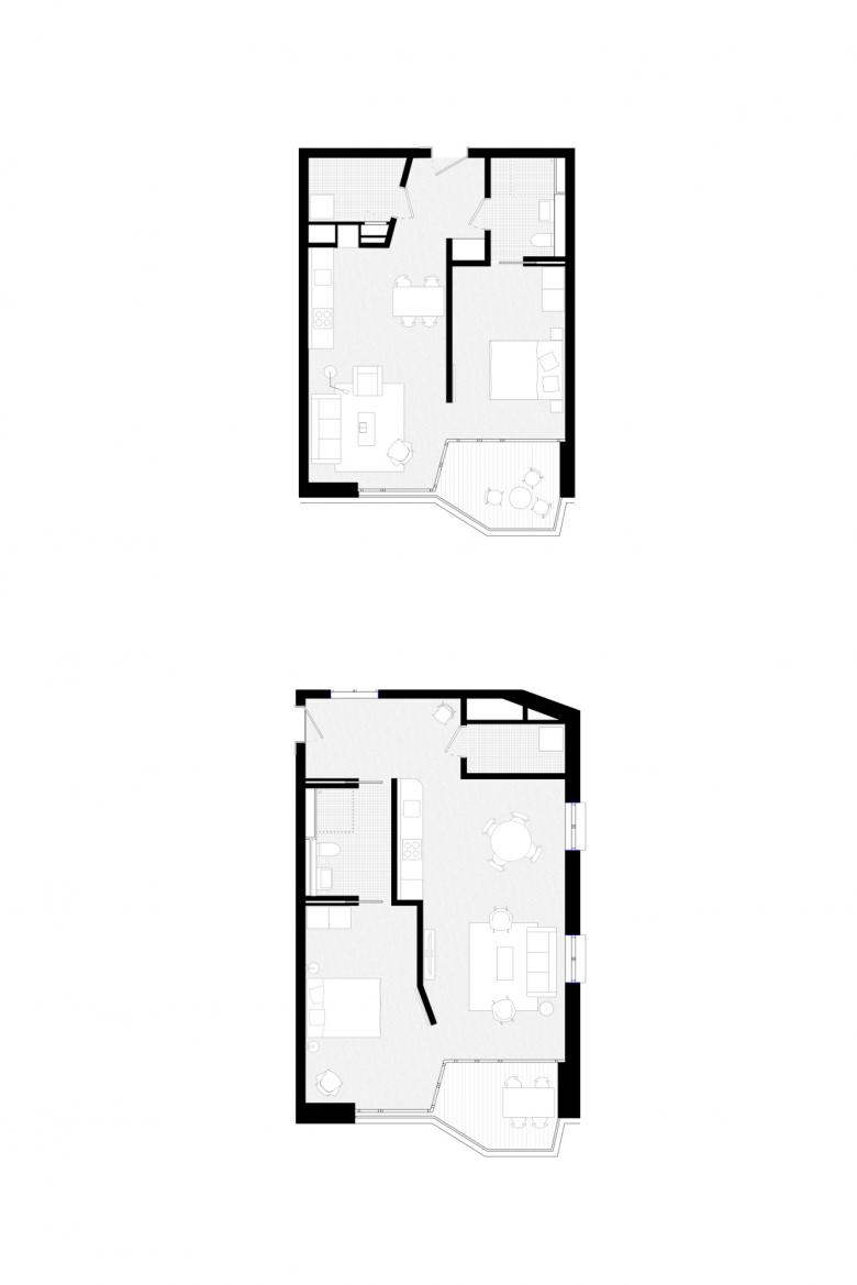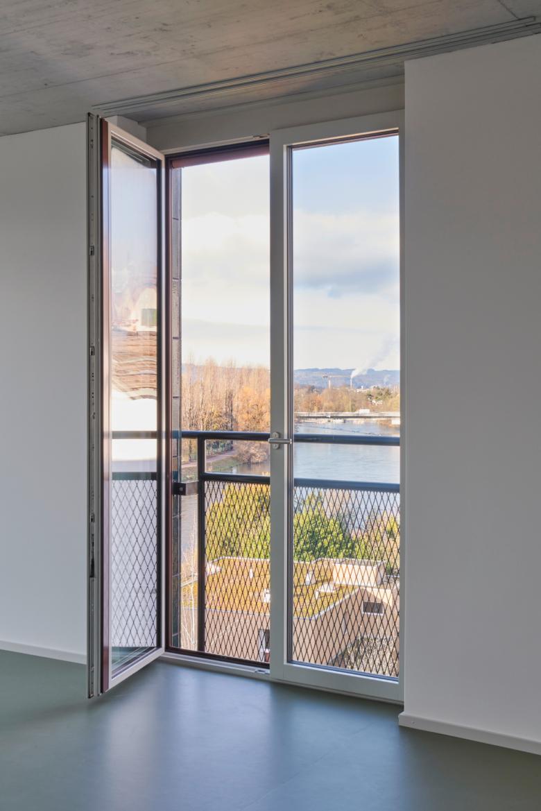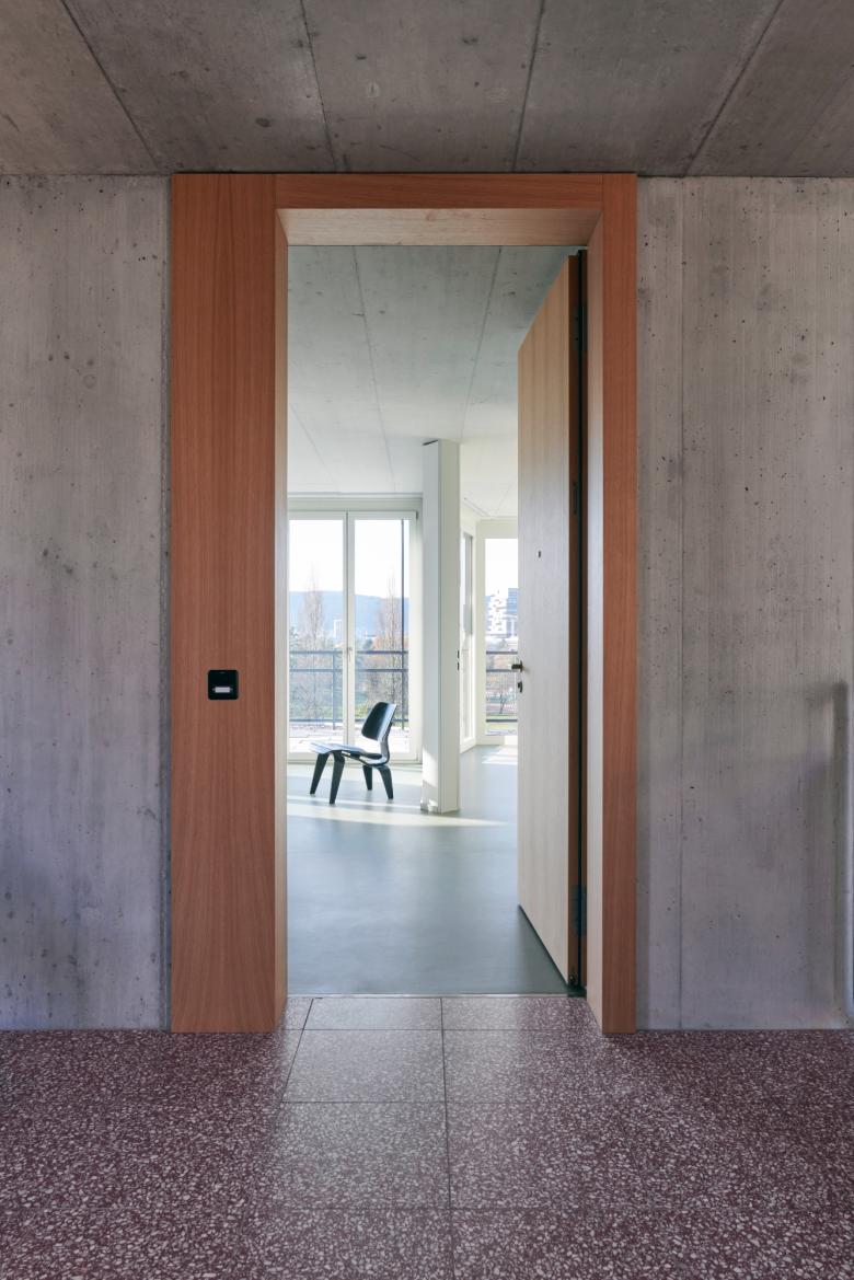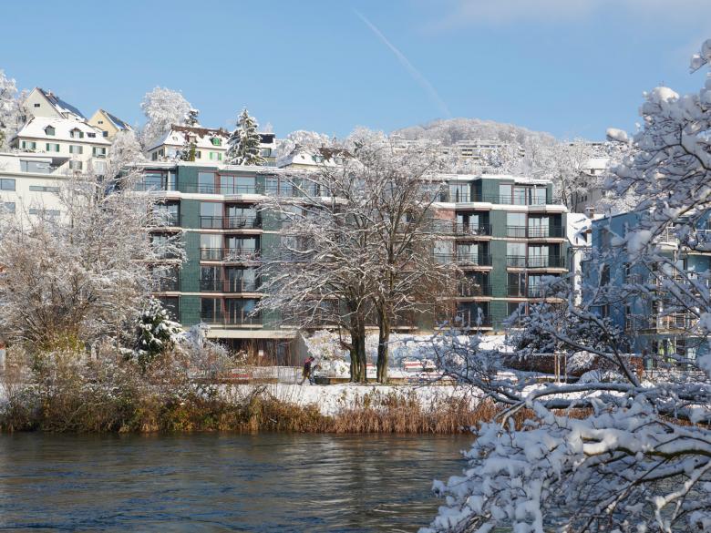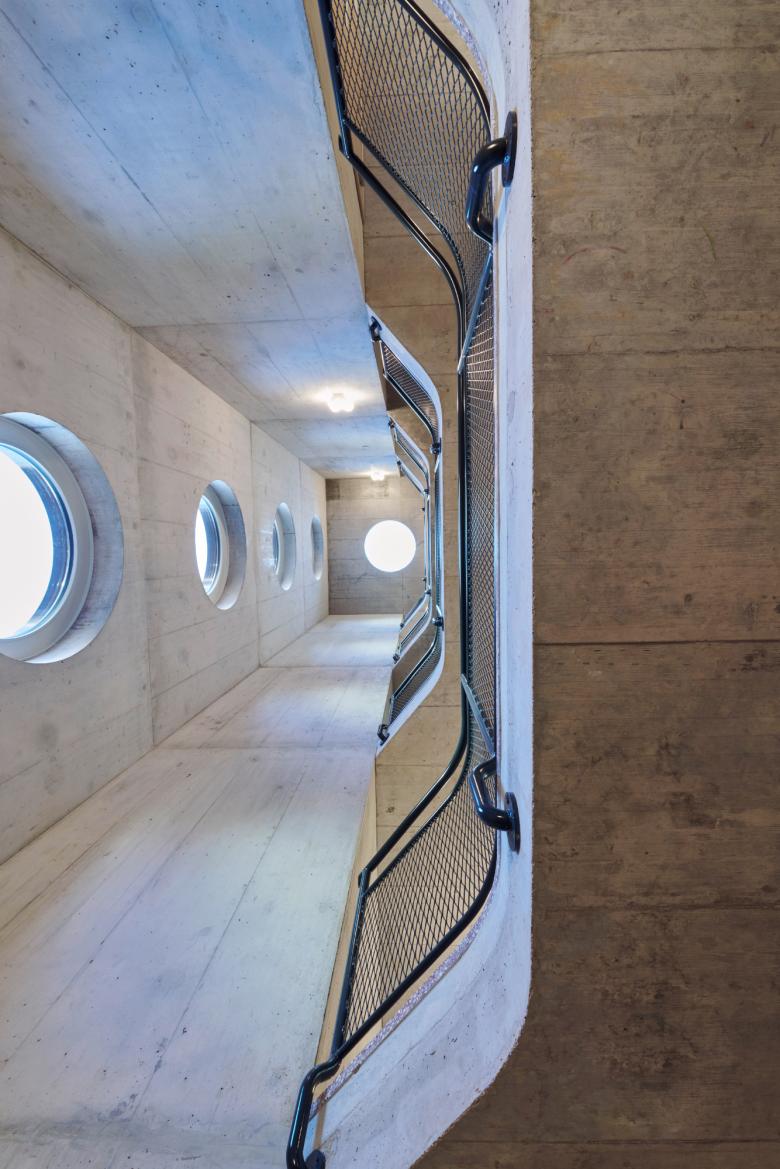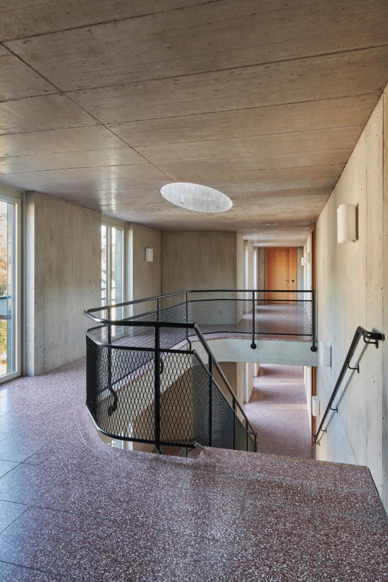 Die Alterswohnungen werden durch eine strassenseitige Gangzone erschlossen, welche als Begegnungsort fungiert und zusätzlich einen Schutz gegen den Lärm der Strasse bildet. Die Wohnungen profitieren alle von der schönen Aussicht und der guten Besonnung Richtung Limmatraum. Der beidseitige Zugang über den Tobeleggweg und von der Strasse Am Wasser wird durch eine klare Gestaltung der Eingänge gestärkt. Dort wo die Erschliessung unter dem Terrain liegt wird sie über den Lichthof und das Treppenauge indirekt erhellt.