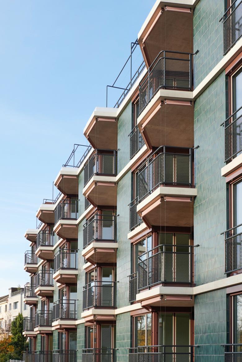 In seiner äusseren Erscheinung reagiert der Baukörper auf die spannungsreiche Situation am Hang und die unterschiedliche Ausrichtung zwischen Strasse und Wasser. Das Attikageschoss ist hangseitig angeordnet, so dass das Gebäude strassenseitig als viergeschossiges Volumen in Erscheinung tritt. Die Fassadenoberfläche mit ihren graugrünen Klinkerplatten tritt dort eher flächig in Erscheinung und wird durch die schmalen, raumhohen Fenster vertikal gegliedert. An den beiden kurzen Seitenfassaden erweitern sich die robusten Betonfensterbänke der Strassenseite zu durchlaufenden horizontalen Gesimsbändern und erzeugen so einen formalen Übergang zur stark waagerecht gegliederten Fassade Richtung Wasser. Die horizontale Wirkung der Südwestfassade wird durch eine grosszügige Balkonschicht intensiviert und dabei durch vertikale Fassadenstücke aufgelockert. Die Fensterfronten garantieren genügend Tageslicht in den einseitig belichteten Wohnungen. Trotz der differenzierten Ausgestaltung der unterschiedlichen Sichtseiten bleibt das Gebäude durch die flächigen umlaufenden Klinkerplatten als gemeinsames Volumen lesbar, welches sich angemessen in seine Umgebung einpasst.