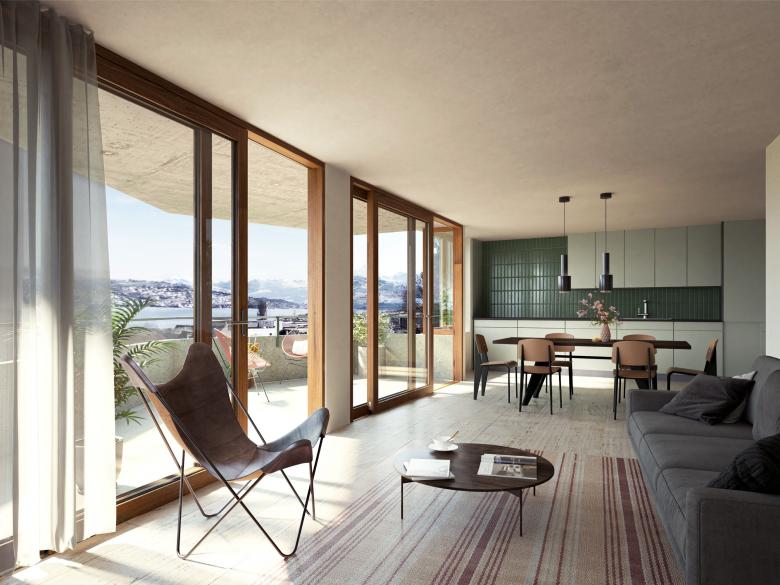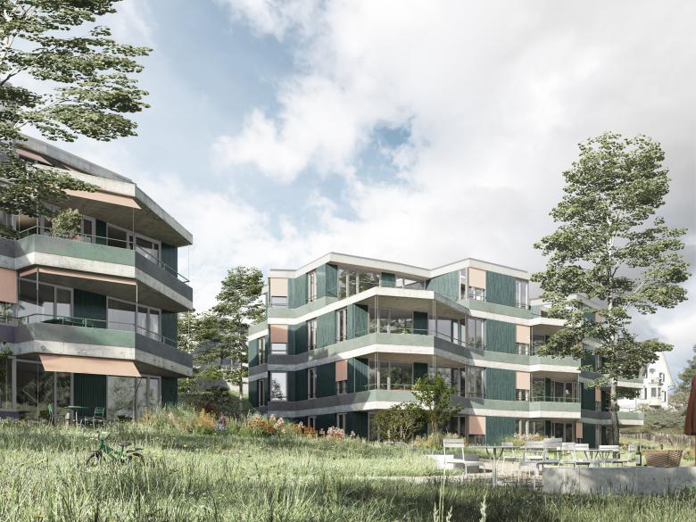 Die Verfasserinnen schlagen zwei sich auffächernde Baukörper entlang der Strasse vor. Diese Konzentration führt strassenseitig zu einer einladenden Eingangssituation und klaren Adressbildung. Die zwei Gebäude werden über eine Art Vorhof betreten und münden in einem grosszügigen, natürlich belichteten Treppenhaus. Durch diese Konzentration des Volumens am Strassenraum profitieren die Wohnungen von der bestmöglichen Lage in Richtung Aussicht. Die zwei Bauten sind aber auch aufgrund ihrer architektonischen Ausformulierung überzeugend in den Landschaftsraum eingebunden.