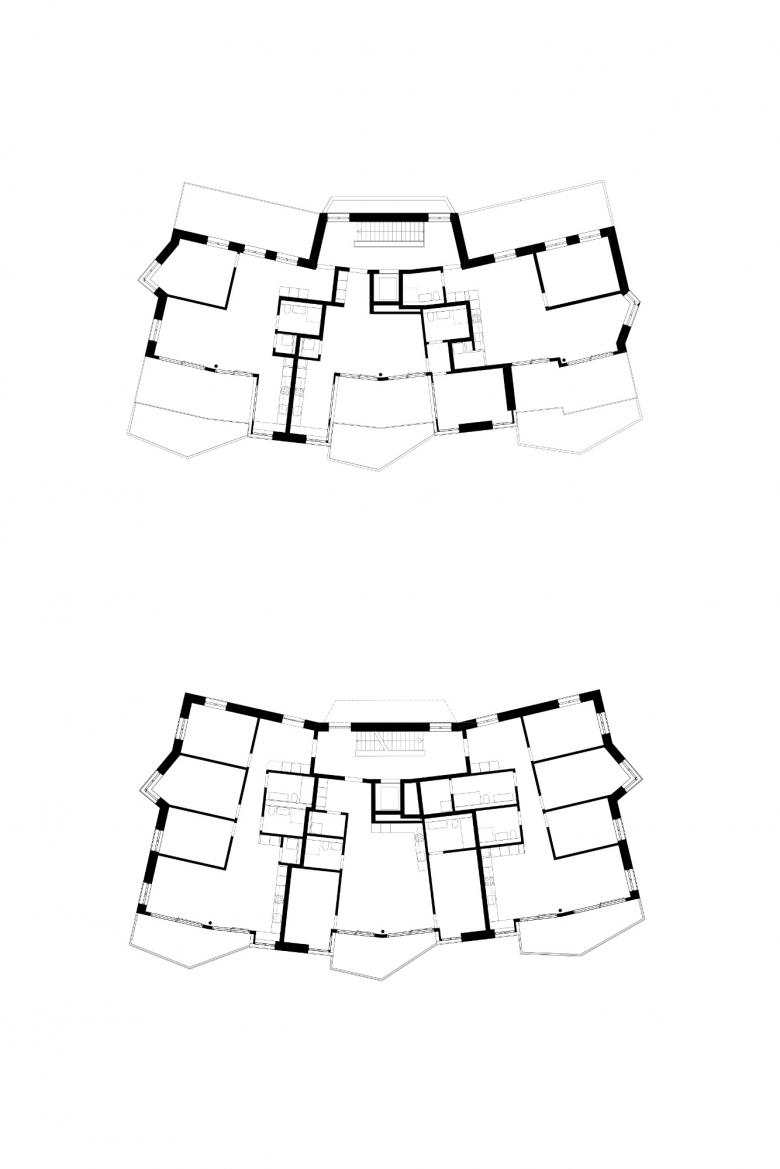Die vorgeschlagenen Wohnungen dieses Projektes werden mit einer Kammerstruktur und einem fliessenden Wohn-/Ess- und Erschliessungsbereich versehen. Die Verfasserinnen entwickeln eine sehr durchgängige Grundrisstypologie mit hohen Raumqualitäten. Die Räume werden geschickt in das Volumen gelegt, so dass sie von innen, wie auch von aussen auf die vorgegebene Situation eingehen. Erker bereichern die Zimmer wie auch die Fassade, der fliessende Raum wird gut zoniert und durch seine Lage im Gebäude profitiert er von verschiedenen Lichtsituationen. Die entstehende Diagonale innerhalb des Wohn- raumes bietet eine reichhaltige Grosszügigkeit, bei welcher die Wohnung nicht auf den ersten Blick erfassbar ist und über Nischen und Plätze den Bewohnern die Möglichkeit gibt, nicht alles auf den ersten Blick preisgeben zu müssen. Die Nasszellen sind gut platziert und liegen strukturell übereinander, was die Gebäudeerschliessung effizient und nachhaltig macht. Gesamthaft können 23 Wohnungen realisiert werden.