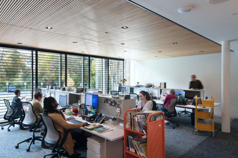 While the flexible spaces, refreshed and re-envisioned interiors, and improved technological infrastructure are the highlights of the new library, the space also provides an expanded connection to the community it serves. Featuring an entrance plaza, a new cafe, and lobby that opens up to the library’s main collection area, daylight and views establish a strong connection from entry to exit. New programming opportunities, such as after-hours scheduling for the Technology Center and increased access of the expanded children’s area, solidify the Library as a communal hub.