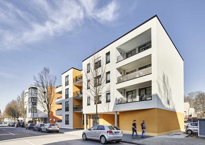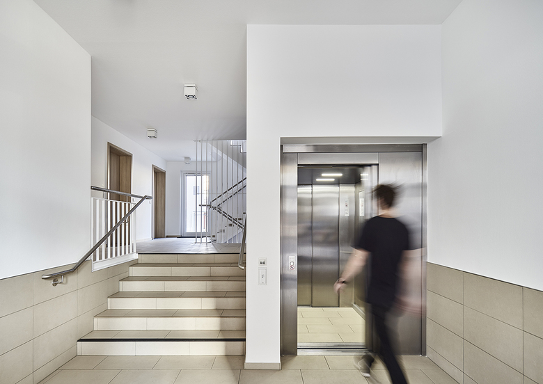 In direkter Nähe zum Rheinhauser Stadtzentrum sind 14 geförderte barrierefreie Wohnungen in der Größe von 46 bis 94 m² entstanden. Ein bunter Wohnungsmix, der sowohl Singles als auch Familien anspricht. Über ein großzügig gestaltetes Foyer gelangen die Bewohner in das helle, in warme Farben getauchte Treppenhaus.