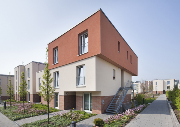 Die Wohnbebauung hat vom Land Nordrhein-Westfalen den Status der Solarsiedlung erhalten. Die einzelnen Bauteile der Außenhülle wurden entsprechend dem Wärme- und Energiekonzept geplant, so dass der Heizenergiebedarf 35 kWh/m²a nicht überschreitet. Eine kontrollierte Wohnungslüftung mit Wärmerückgewinnung, Sonnenkollektoren und Fotovoltaik sind energetische Bausteine der Bebauung. Der 1. Bauabschnitt umfasst 57 Wohnungen in 8 Häusern und 3 Tiefgaragen. Davon werden 21 Wohnungen im Rahmen des sozialen Wohnungsbaus gefördert. Das Bauvolumen wird durch Vor- und Rücksprünge plastisch gestaltet. Die gläsernen Treppenhäuser, als Fuge ausgebildet, fördern die Kleinteiligkeit der Bebauung. Im Erdgeschoss sind alle Wohnungen barrierefrei. Individuelle Eingänge schaffen Privatheit und geben den Bewohnern eine “eigene Adresse“. Die geförderten Gebäude erhalten einen Aufzug; somit sind 60 % der Wohneinheiten barrierefrei und altengerecht. Die aufgesetzten farbigen Wohnboxen geben dem neuen Quartier einen eigenständigen Charakter.