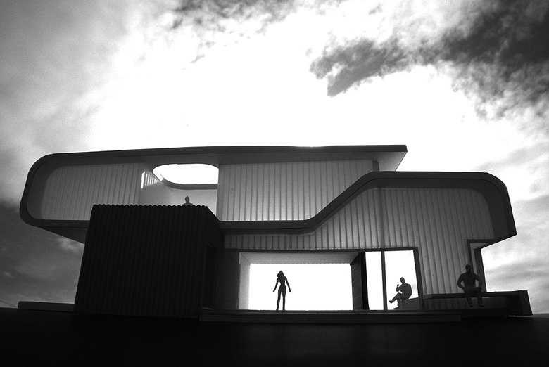 多雪地に建つ住宅の計画です。あたかも一枚のプレートが折り曲げられて全体がつくられているかのようなかたちをしています。