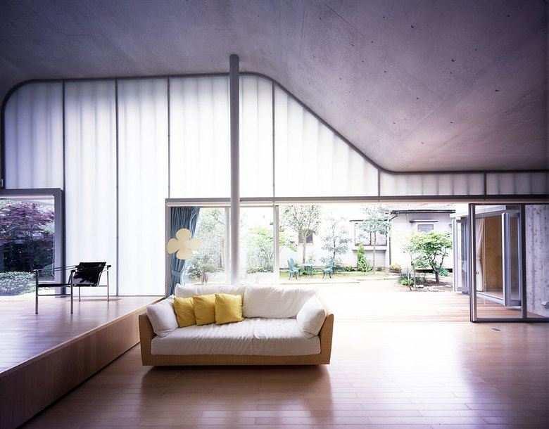 これまでのプロジェクトでは、積雪への考慮から平らな屋根面が形成されることで、さまざま工夫を重ねたものの、なかなか箱形建築の集合体という域を脱することはできませんでした。この計画でも、最初は箱形のかたちからスタディを始めたのですが、何とか箱形建築から脱する方法はないかと試行錯誤を重ねた結果、床・壁・屋根が連続的につながり、あたかも一枚のプレートを折り曲げてつくったかのような構成が得られました。〈閉じた箱〉から〈一枚のプレート〉へ、〈リジッドな幾何学〉ではなく〈なめらかな幾何学〉を、それぞれ置き換えることによってできあがる空間をこの住宅で目指しました。