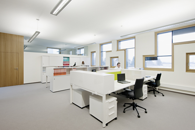 Die Büroflächen von ca. 1200 m2 sind der Unternehmenskultur entsprechend auf nur einer Ebene im Obergeschoss organisiert. Die damit entstehende hierarchielose räumliche Organisationsstruktur zwischen offenen und geschlossen Büros sowie einer freien Zwischenzone soll die Kommunikation der Mitarbeiter fördern und für optimale Abläufe sorgen. Zwei innenliegende Höfe schaffen zusätzlich ein Klima des Wohlbefindens und der Konzentration.